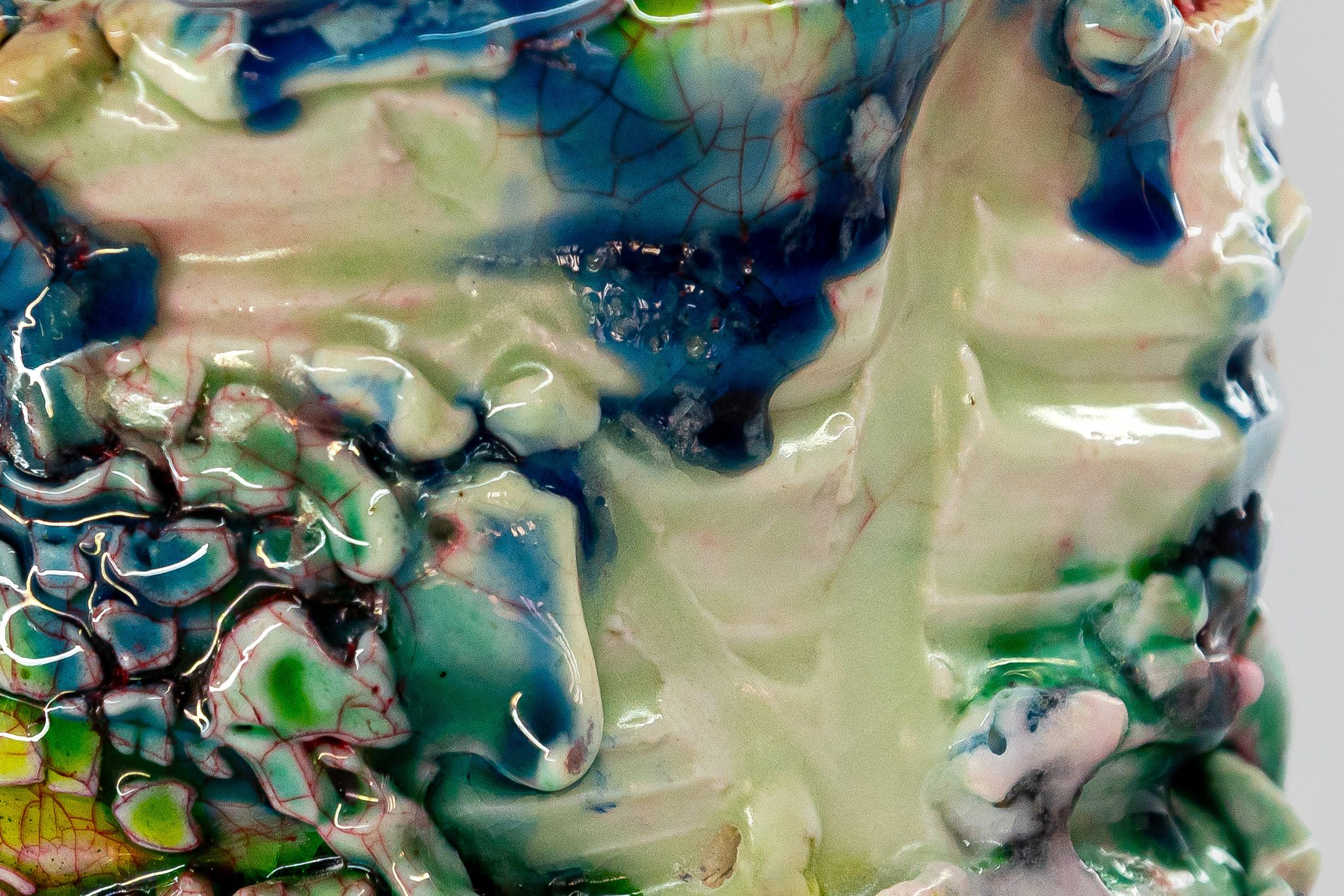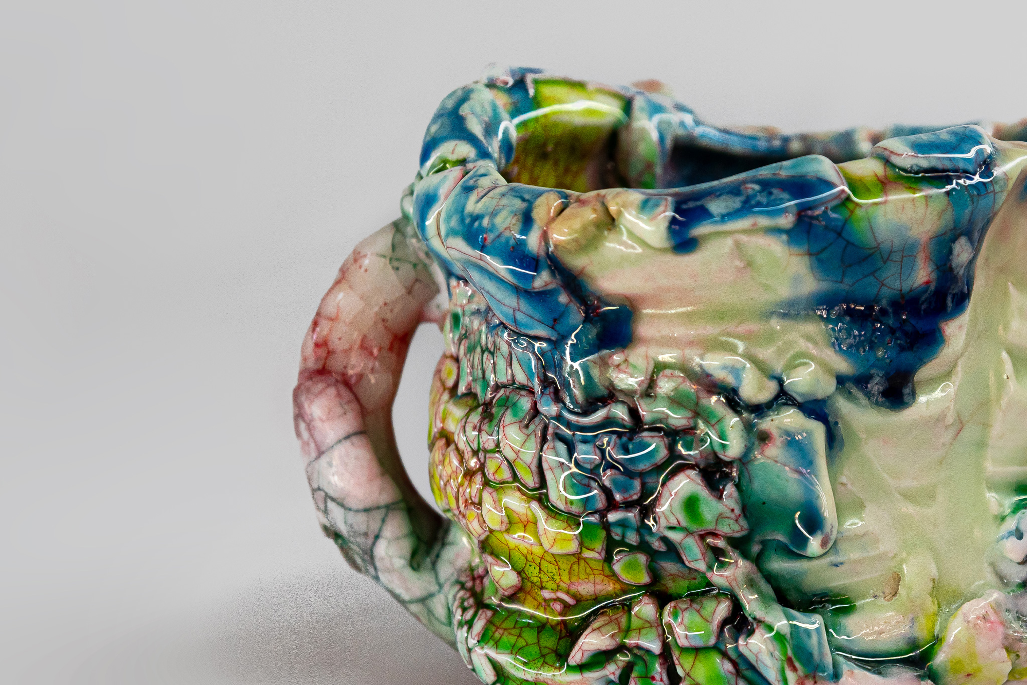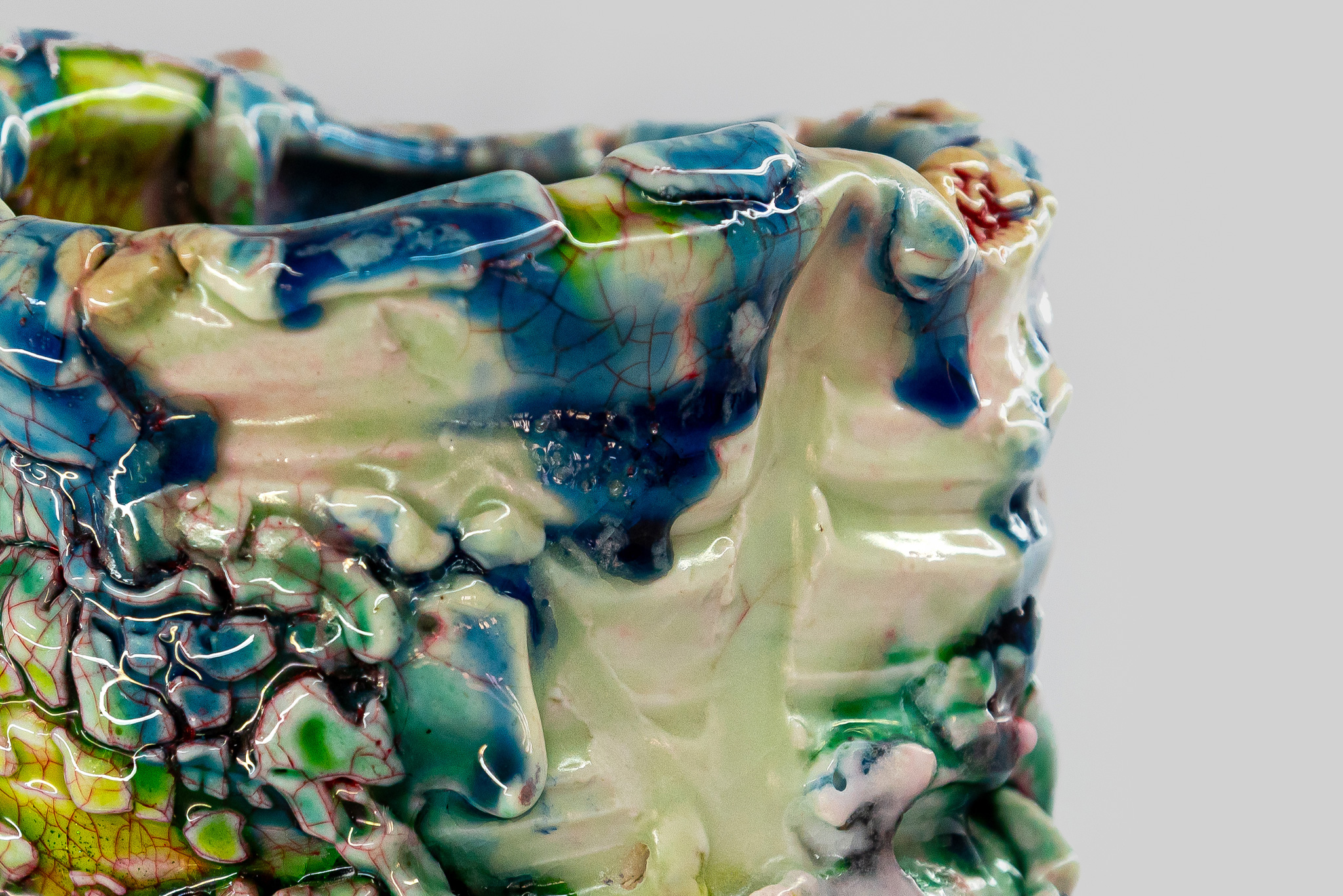 At the same time, Ujiie’s practice is deeply informed by the conventions of traditional Japanese pottery, particularly in his use of technical fusions that bridge historical methods with contemporary form. By adapting the kintsugi lacquer mending process, he brings a layered sensibility to his practice; his unpredictable glazes—thickly applied and often suggesting a synthetic gloss—conjure a striking sense of spontaneity within otherwise carefully constructed, deliberate forms. These works gesture toward utility, subtly alluding to conventional vessels or architectural fragments—recalling Betty Woodman’s reimagining of ceramic traditions through hybrid, architectonic gestures—while their meanings unfold through multiple layers of interpretation and ambiguity. His ceramics also evoke an animated quality: bulbous, soft-edged, almost creaturely forms that suggest narrative or anthropomorphic character, aligning with the expressive, sculptural approach of Ken Price and inviting viewers to engage with them as lively, enigmatic presences rather than mere objects.