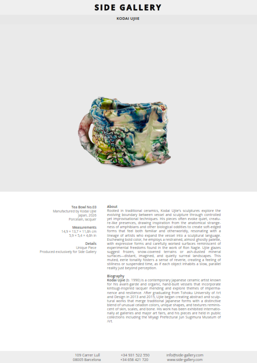 Kodai Ujiie (b. 1990) is a contemporary Japanese ceramic artist known for his avant-garde and organic, hand-built vessels that incorporate kintsugi-inspired lacquer mending and explore themes of impermanence and resilience. After graduating from Tohoku University of Art and Design in 2013 and 2015, Ujiie began creating abstract and sculptural works that merge traditional Japanese forms with a distinctive blend of unusual celadon colors, unique shapes, and textures reminiscent of skin, scales, and bone. His work has been exhibited internationally at galleries and major art fairs, and his pieces are held in public collections including the Miyagi Prefectural Jun Sugimura Museum of Art.