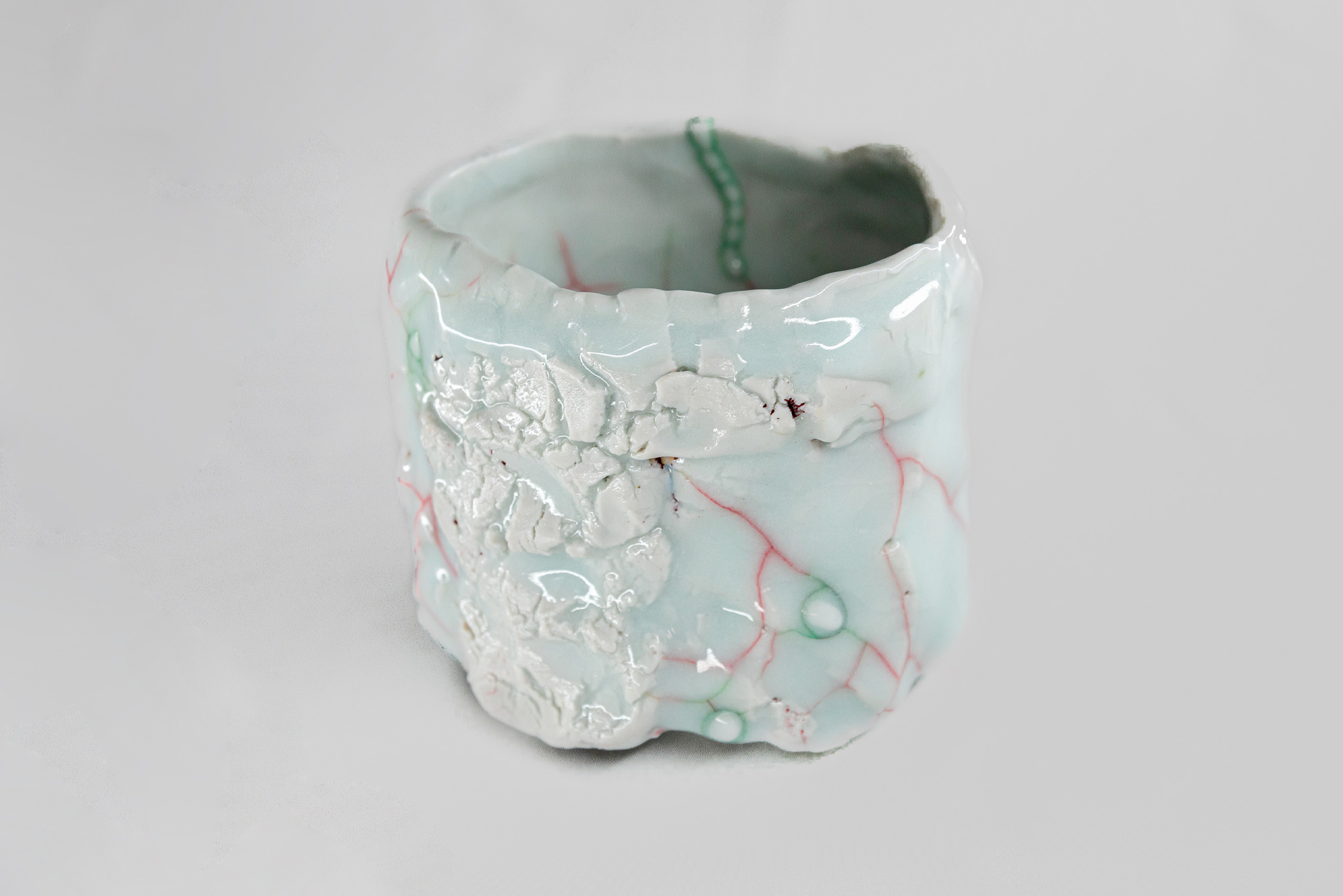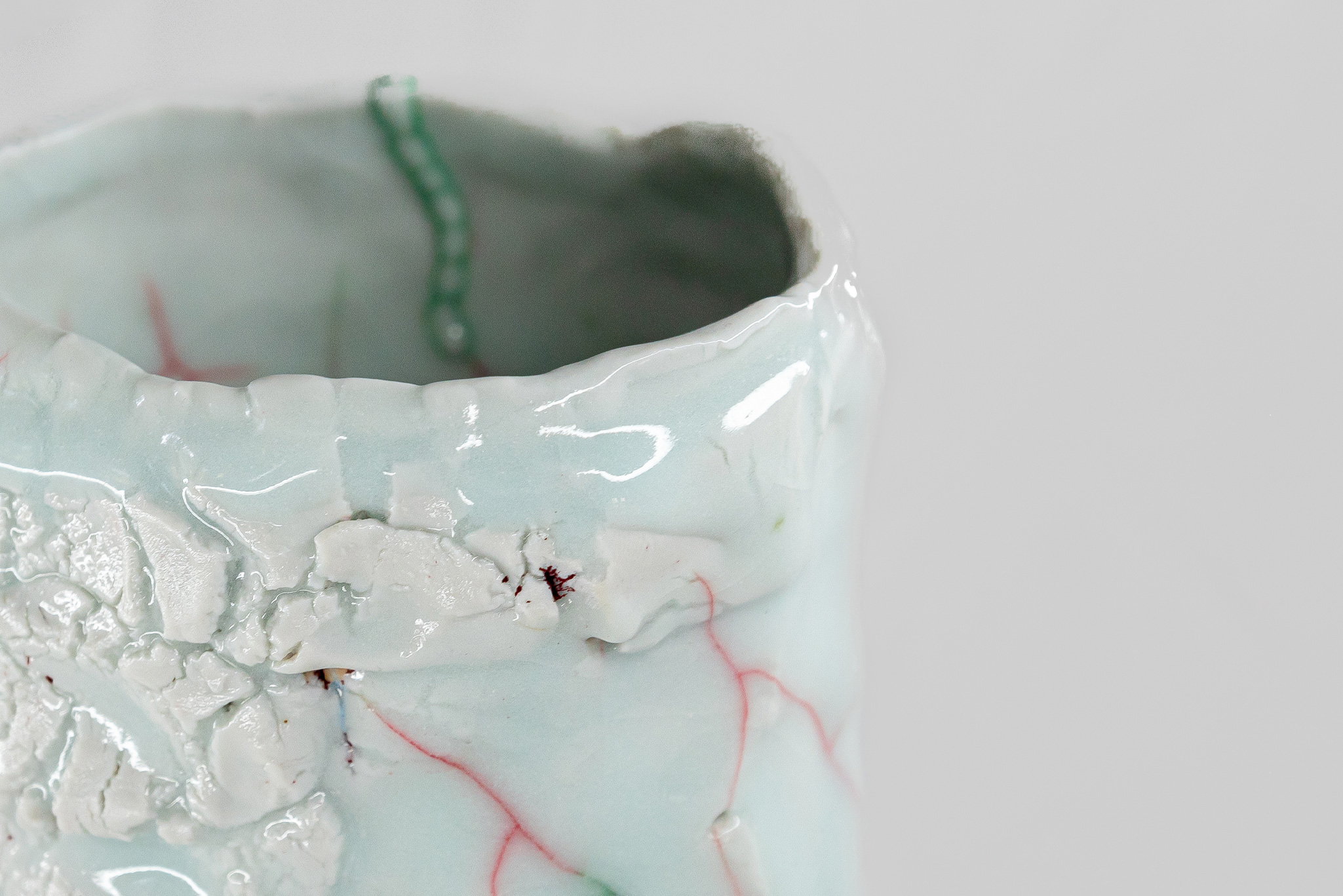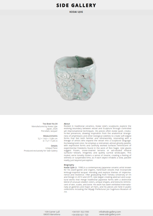Kodai Ujiie (b. 1990) is a contemporary Japanese ceramic artist known for his avant-garde and organic, hand-built vessels that incorporate kintsugi-inspired lacquer mending and explore themes of impermanence and resilience. After graduating from Tohoku University of Art and Design in 2013 and 2015, Ujiie began creating abstract and sculptural works that merge traditional Japanese forms with a distinctive blend of unusual celadon colors, unique shapes, and textures reminiscent of skin, scales, and bone. His work has been exhibited internationally at galleries and major art fairs, and his pieces are held in public collections including the Miyagi Prefectural Jun Sugimura Museum of Art.