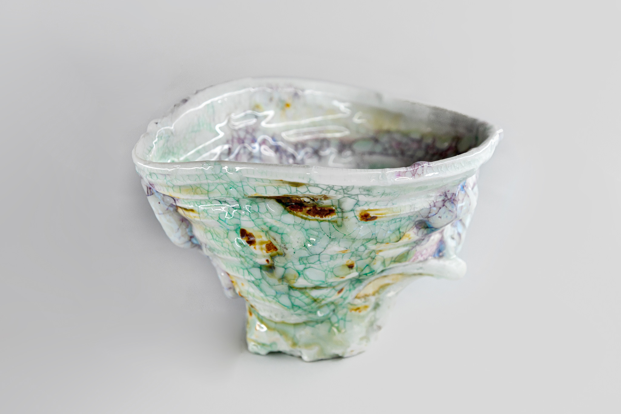 Rooted in traditional ceramics, Kodai Ujiie’s sculptures explore the evolving boundary between vessel and sculpture through controlled yet improvisational techniques. His pieces often evoke quiet, creature-like presences, drawing inspiration from the anatomical strangeness of amphibians and other biological oddities to create soft-edged forms that feel both familiar and otherworldly, resonating with a lineage of artists who expand the vessel into a sculptural language. Eschewing bold color, he employs a restrained, almost ghostly palette, with expressive forms and carefully worked surfaces reminiscent of experimental freedoms found in the work of Ron Nagle. Ujiie glazes suggest frozen, snow-covered terrains or ash-dusted mineral surfaces—distant, imagined, and quietly surreal landscapes. This muted, eerie tonality fosters a sense of reverie, creating a feeling of stillness or suspended time, as if each object inhabits a slow, parallel reality just beyond perception.