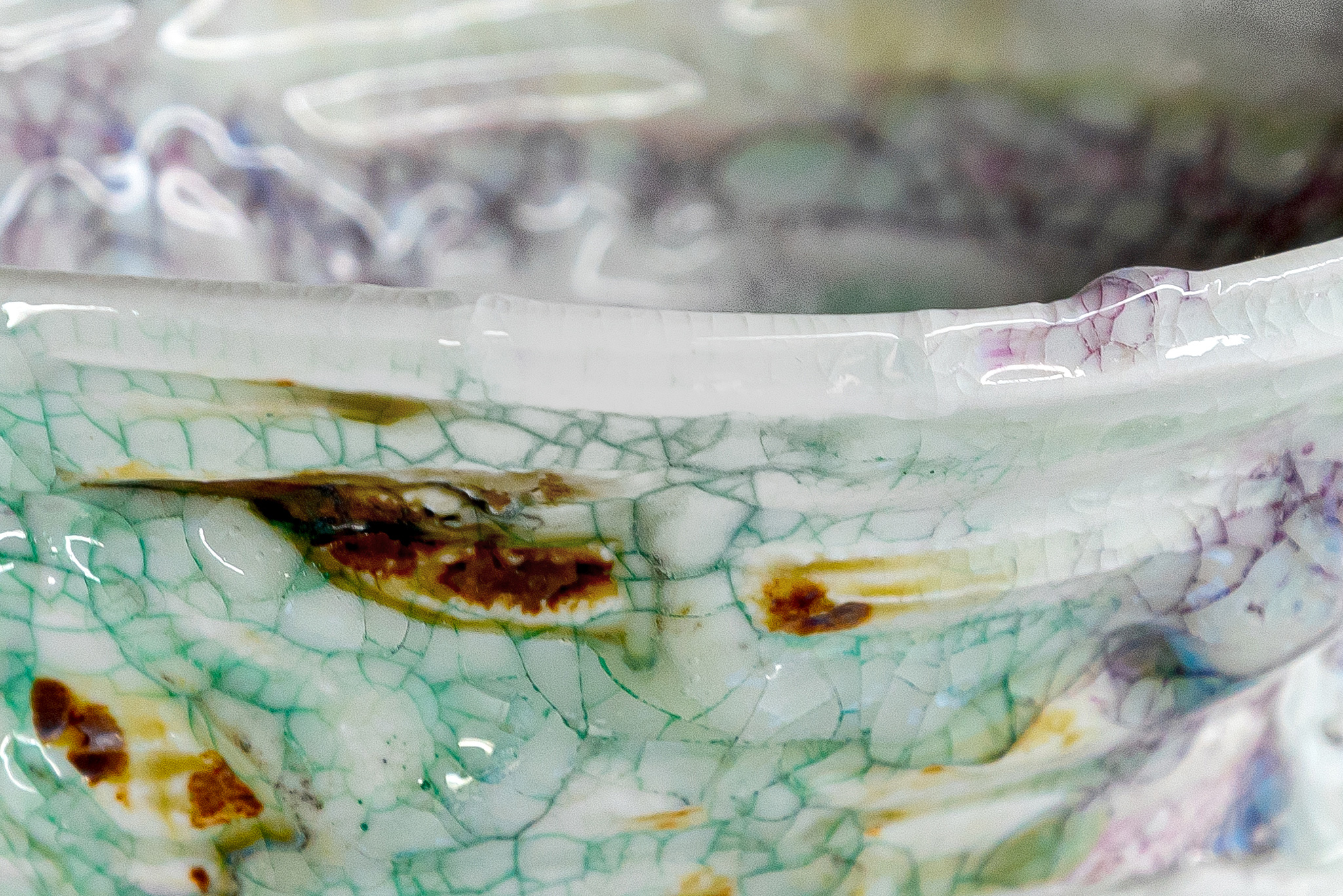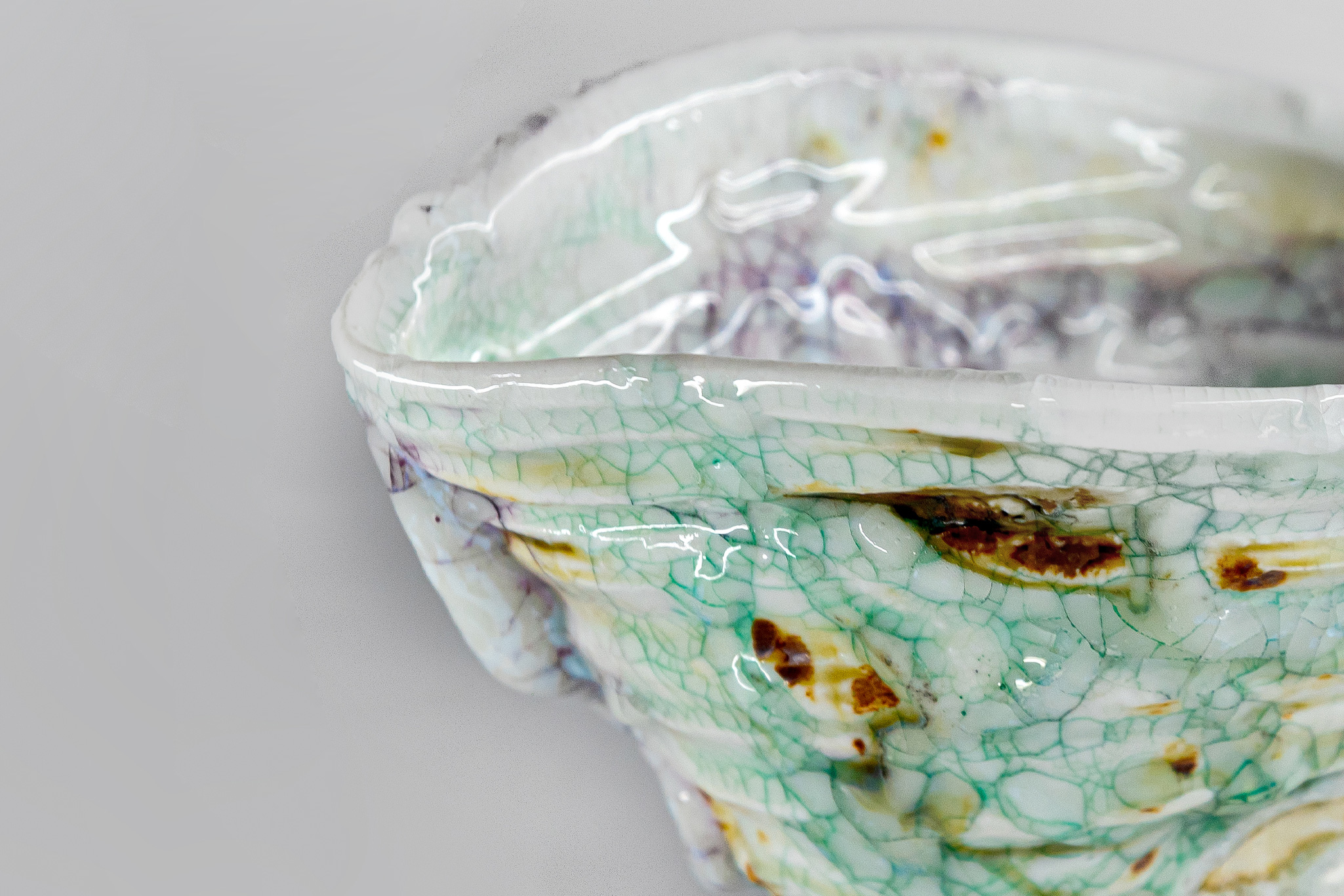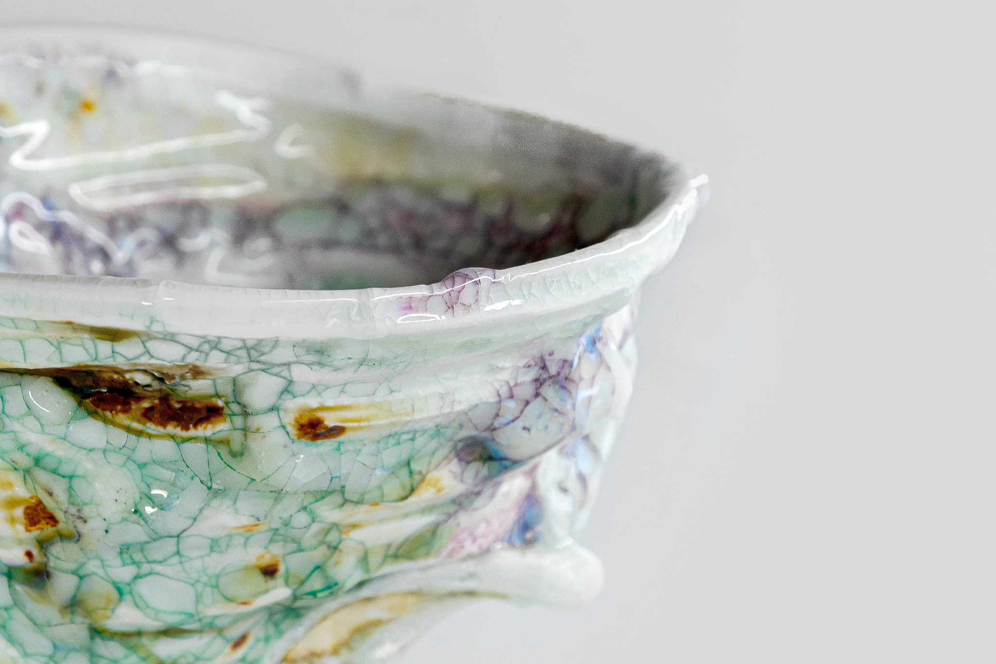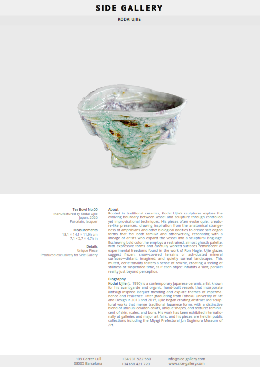 Kodai Ujiie (b. 1990) is a contemporary Japanese ceramic artist known for his avant-garde and organic, hand-built vessels that incorporate kintsugi-inspired lacquer mending and explore themes of impermanence and resilience. After graduating from Tohoku University of Art and Design in 2013 and 2015, Ujiie began creating abstract and sculptural works that merge traditional Japanese forms with a distinctive blend of unusual celadon colors, unique shapes, and textures reminiscent of skin, scales, and bone. His work has been exhibited internationally at galleries and major art fairs, and his pieces are held in public collections including the Miyagi Prefectural Jun Sugimura Museum of Art.