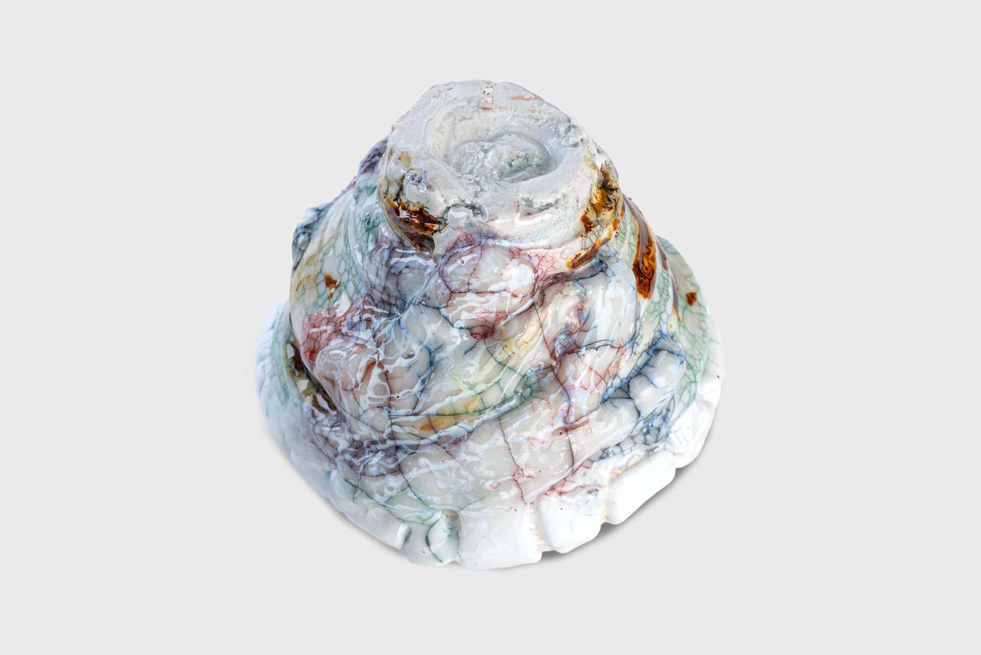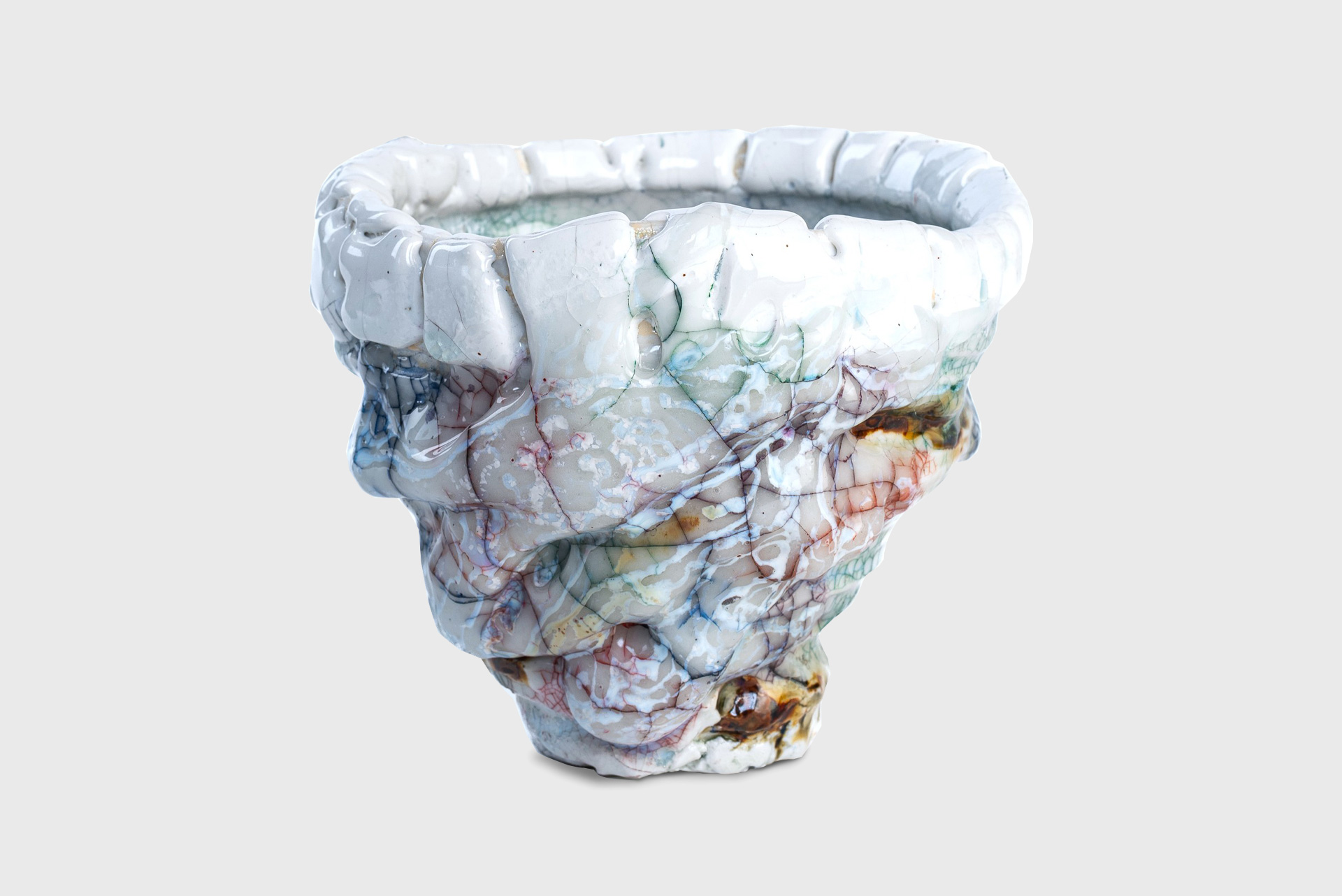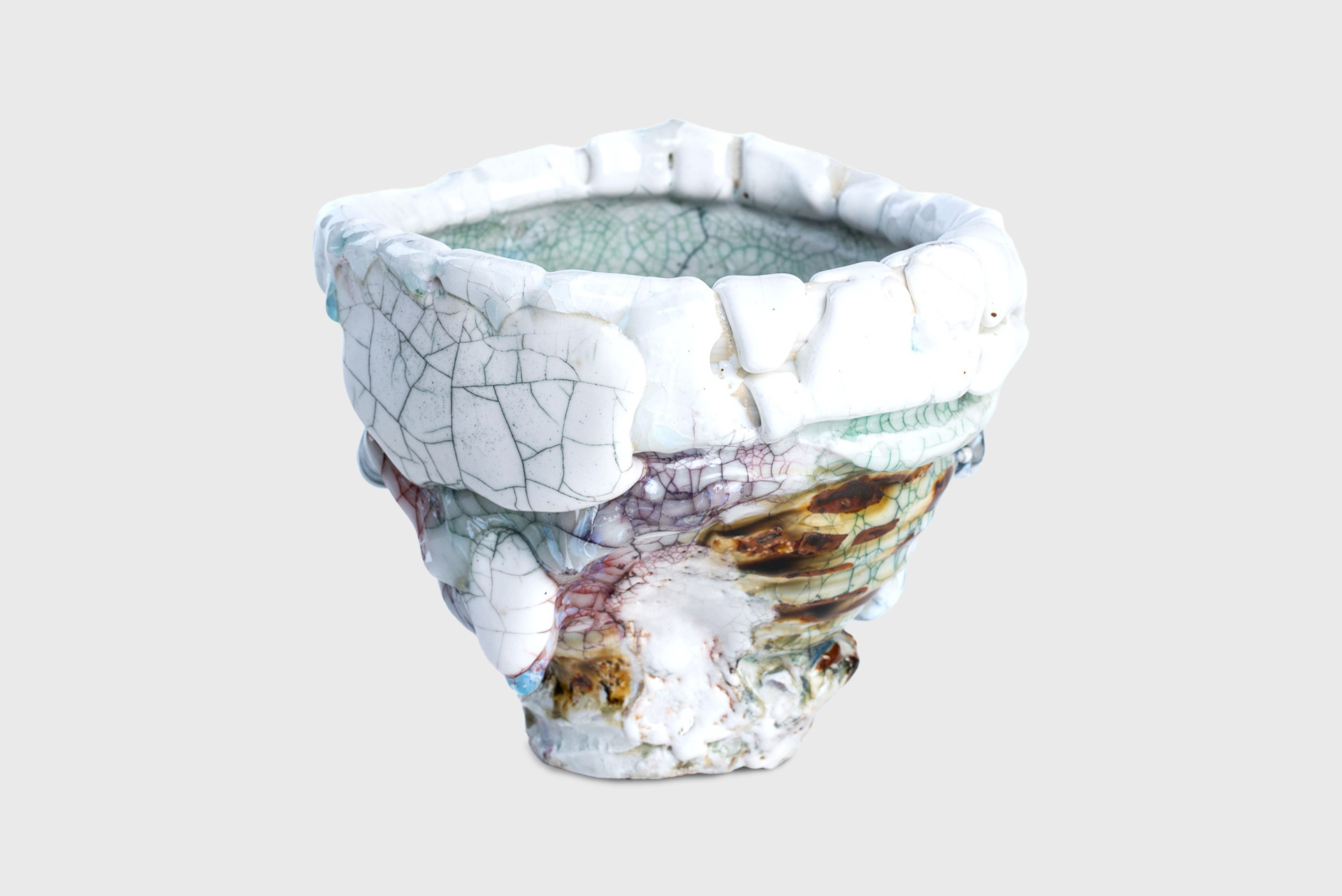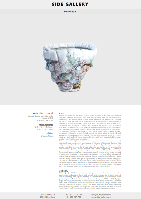 Rooted in traditional ceramics, Kodai Ujiie’s sculptures explore the evolving boundary between vessel and sculpture through controlled yet improvisational techniques. His pieces often evoke quiet, creature-like presences, drawing inspiration from the anatomical strangeness of amphibians and other biological oddities to create soft-edged forms that feel both familiar and otherworldly, resonating with a lineage of artists who expand the vessel into a sculptural language. Eschewing bold color, he employs a restrained, almost ghostly palette, with expressive forms and carefully worked surfaces reminiscent of experimental freedoms found in the work of Ron Nagle. Ujiie glazes suggest frozen, snow-covered terrains or ash-dusted mineral surfaces—distant, imagined, and quietly surreal landscapes. This muted, eerie tonality fosters a sense of reverie, creating a feeling of stillness or suspended time, as if each object inhabits a slow, parallel reality just beyond perception.