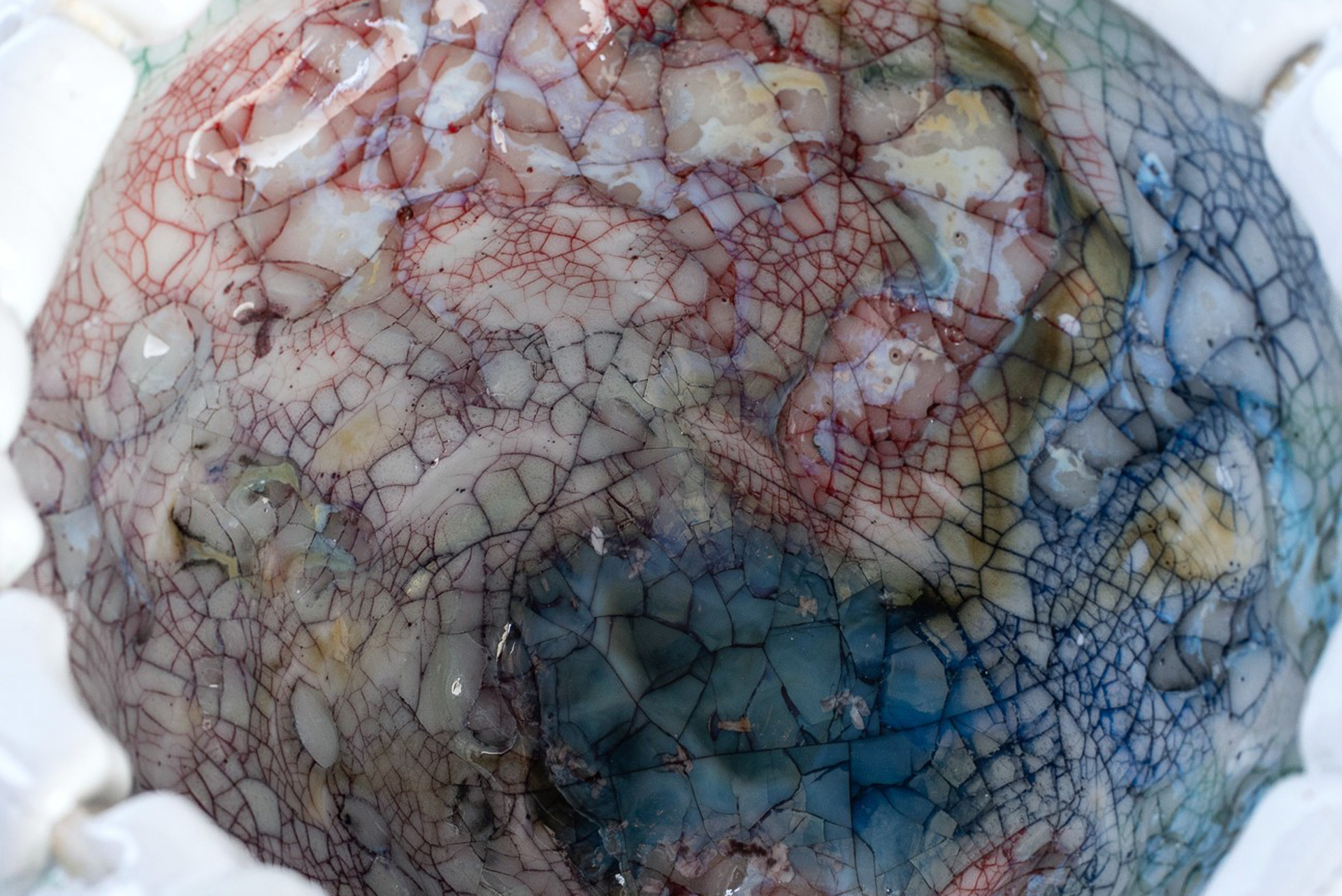 At the same time, Ujiie’s practice is deeply informed by the conventions of traditional Japanese pottery, particularly in his use of technical fusions that bridge historical methods with contemporary form. By adapting the kintsugi lacquer mending process, he brings a layered sensibility to his practice; his unpredictable glazes—thickly applied and often suggesting a synthetic gloss—conjure a striking sense of spontaneity within otherwise carefully constructed, deliberate forms. These works gesture toward utility, subtly alluding to conventional vessels or architectural fragments—recalling Betty Woodman’s reimagining of ceramic traditions through hybrid, architectonic gestures—while their meanings unfold through multiple layers of interpretation and ambiguity. His ceramics also evoke an animated quality: bulbous, soft-edged, almost creaturely forms that suggest narrative or anthropomorphic character, aligning with the expressive, sculptural approach of Ken Price and inviting viewers to engage with them as lively, enigmatic presences rather than mere objects.