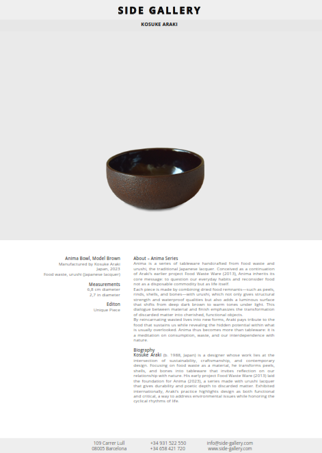 By reincarnating wasted lives into new forms, Araki pays tribute to the food that sustains us while revealing the hidden potential within what is usually overlooked. Anima thus becomes more than tableware: it is a meditation on consumption, waste, and our interdependence with nature.