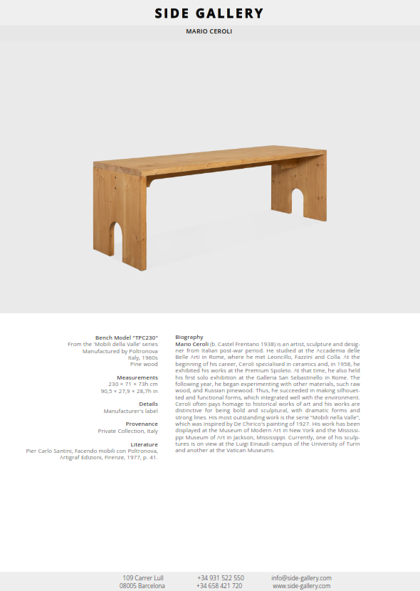 Mario Ceroli (b. Castel Frentano 1938) is an artist, sculpture and designer from Italian post-war period. He studied at the Accademia delle Belle Arti in Rome, where he met Leoncillo, Fazzini and Colla. At the beginning of his career, Ceroli specialised in ceramics and, in 1958, he exhibited his works at the Premium Spoleto. At that time, he also held his first solo exhibition at the Galleria San Sebastinello in Rome. The following year, he began experimenting with other materials, such raw wood, and Russian pinewood. Thus, he succeeded in making silhouetted and functional forms, which integrated well with the environment. Ceroli often pays homage to historical works of art and his works are distinctive for being bold and sculptural, with dramatic forms and strong lines. His most outstanding work is the serie "Mobili nella Valle", which was inspired by De Chirico's painting of 1927. His work has been displayed at the Museum of Modern Art in New York and the Mississippi Museum of Art in Jackson, Mississippi. Currently, one of his sculptures is on view at the Luigi Einaudi campus of the University of Turin and another at the Vatican Museums.