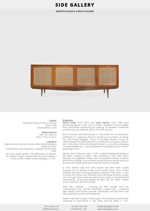 Martin Eisler (Vienna, Austria, 1913 - São Paulo, Brazil, 1977) was an architect and furniture designer. He was part of a group of European architects and designers who left Europe during the chaos of the Second World War and went to live and work in Brazil. Eisler stood out amongst this group of creatives. His work was at the forefront of modern furniture design in Brazil, which flourished through the 50s and 60s. Eisler's work in partnership with Carlo Hauner (1927-1996) was of particular significance.