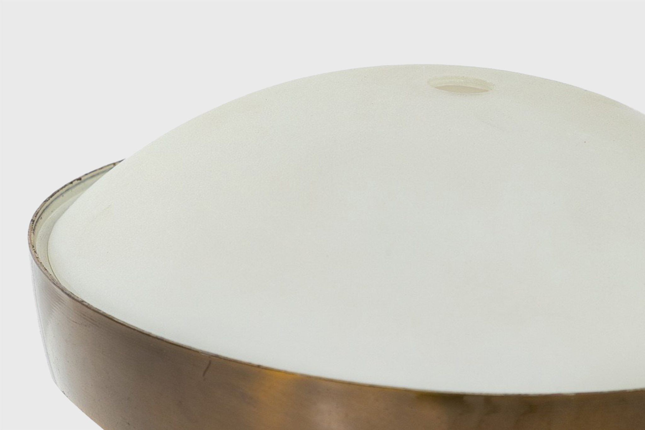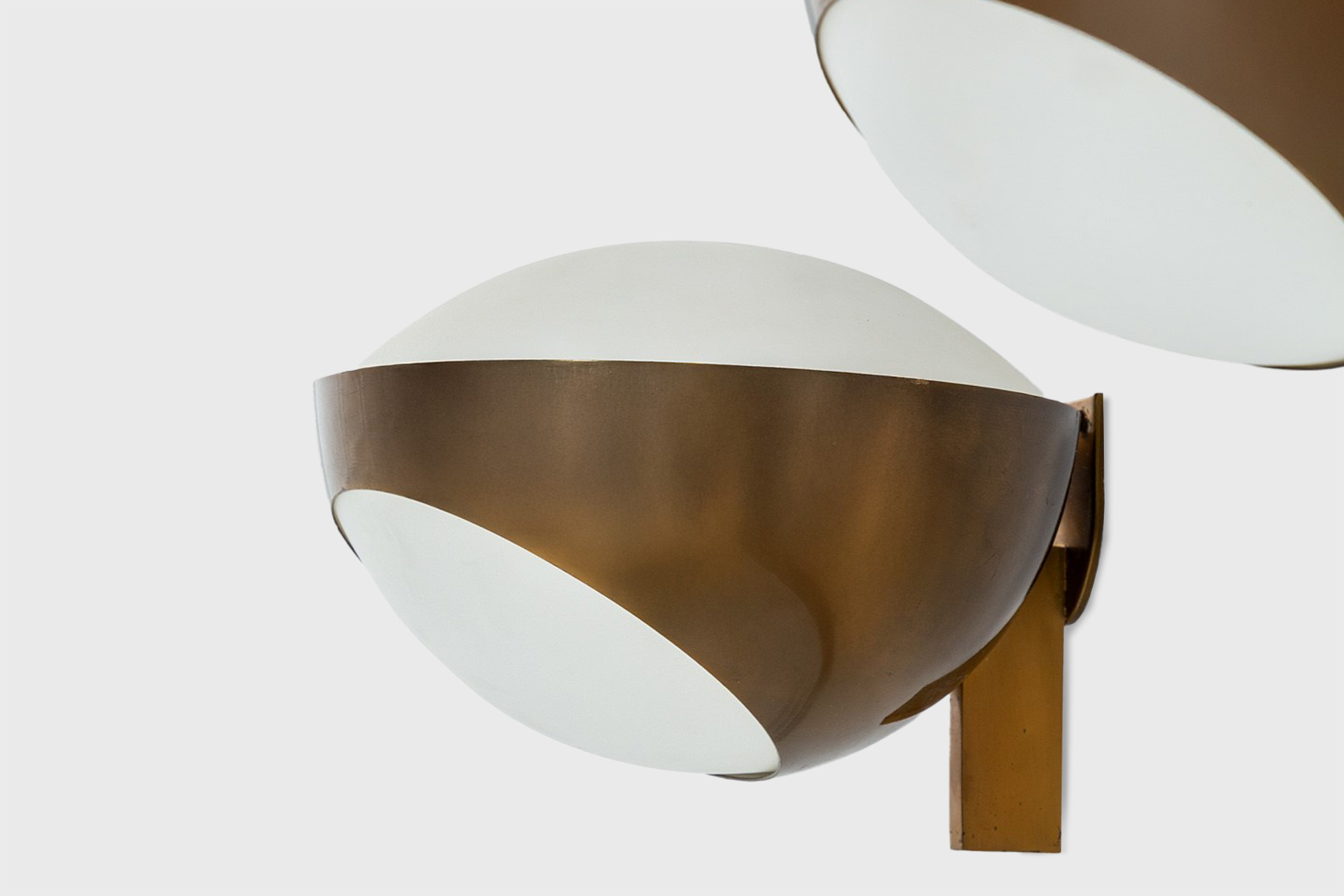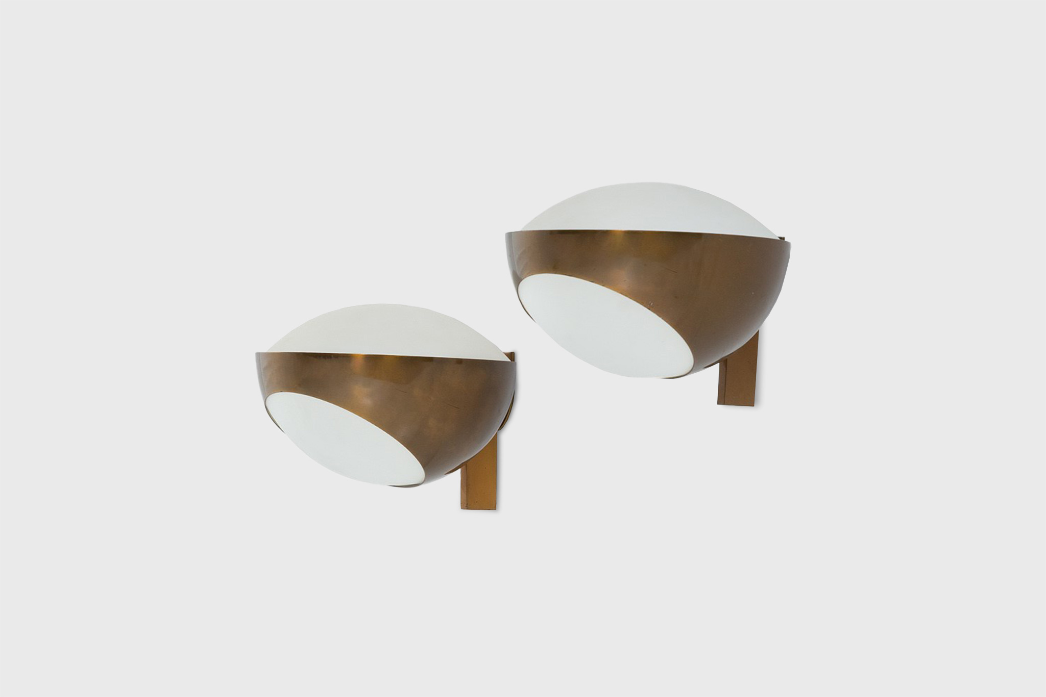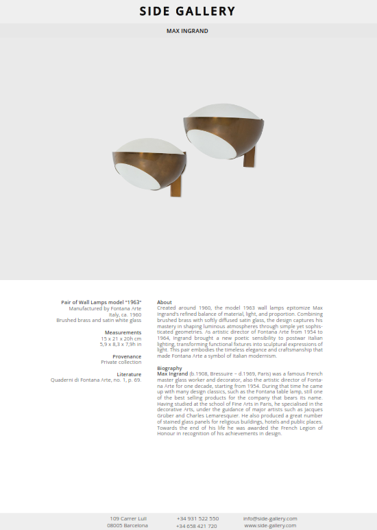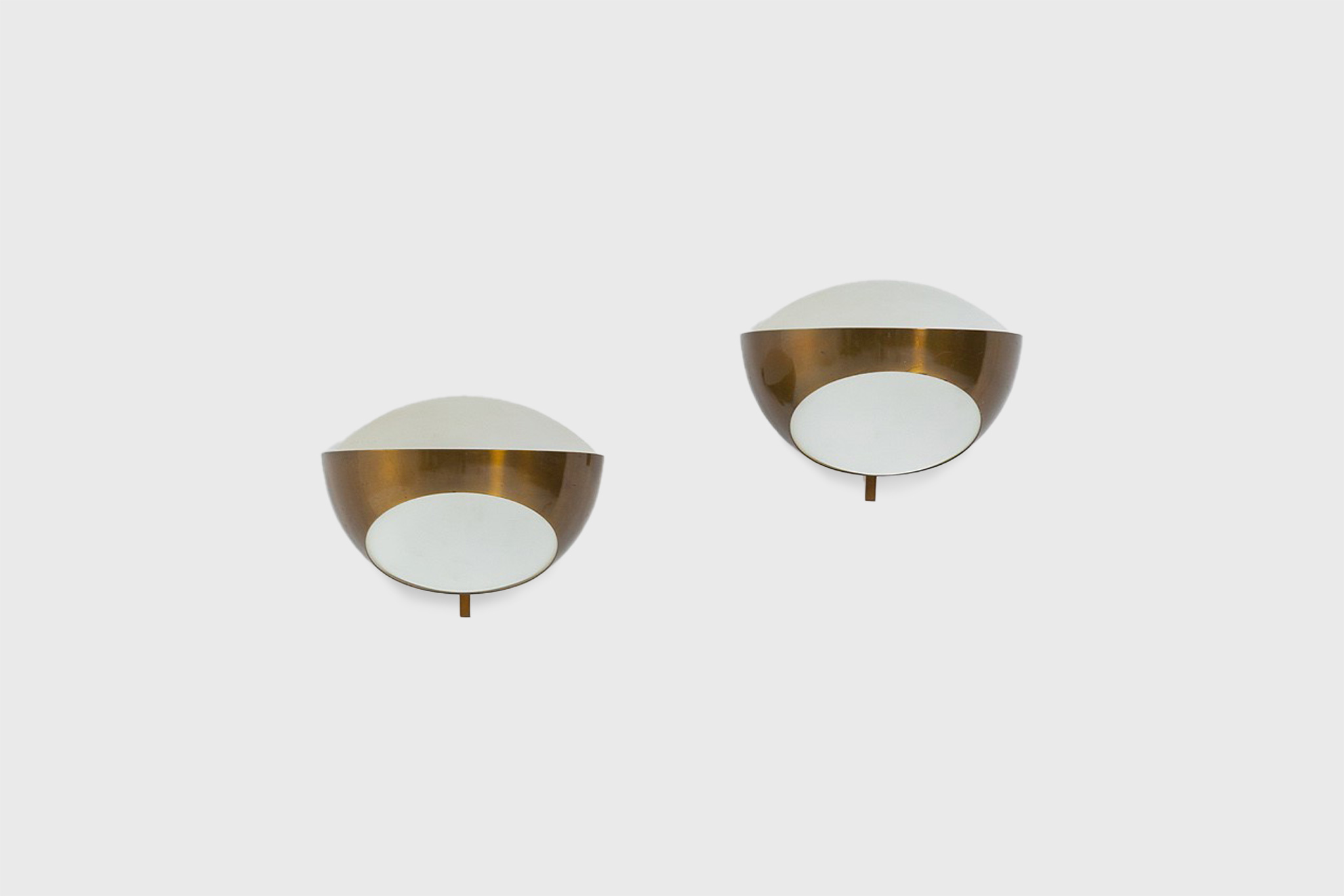 Created around 1960, the model 1963 wall lamps epitomize Max Ingrand’s refined balance of material, light, and proportion. Combining brushed brass with softly diffused satin glass, the design captures his mastery in shaping luminous atmospheres through simple yet sophisticated geometries. As artistic director of Fontana Arte from 1954 to 1964, Ingrand brought a new poetic sensibility to postwar Italian lighting, transforming functional fixtures into sculptural expressions of light. This pair embodies the timeless elegance and craftsmanship that made Fontana Arte a symbol of Italian modernism.