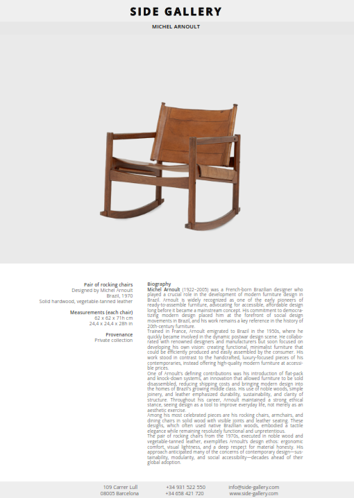 The pair of rocking chairs from the 1970s, executed in noble wood and vegetable-tanned leather, exemplifies Arnoult’s design ethos: ergonomic comfort, visual lightness, and a deep respect for material honesty. His approach anticipated many of the concerns of contemporary design—sustainability, modularity, and social accessibility—decades ahead of their global adoption.