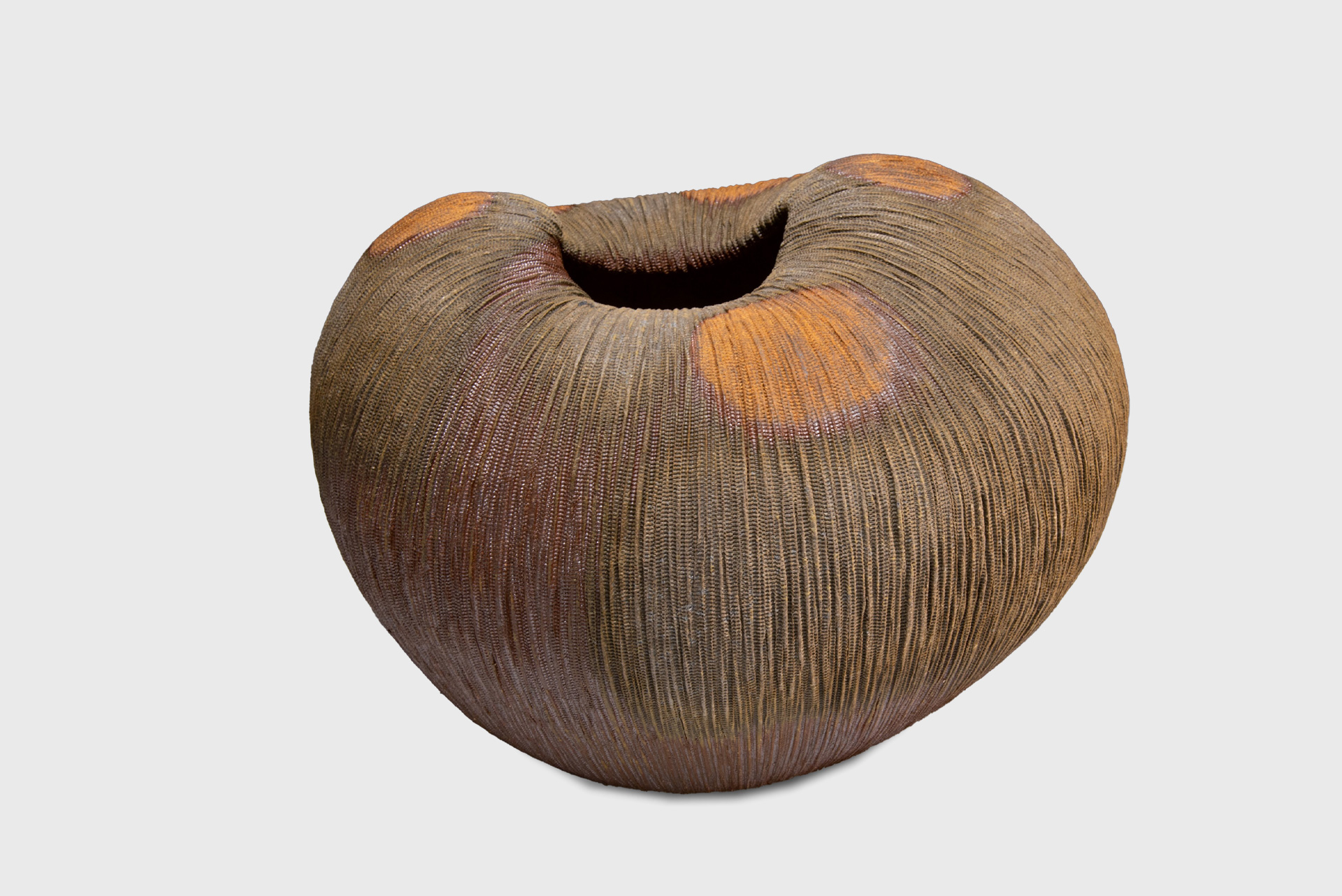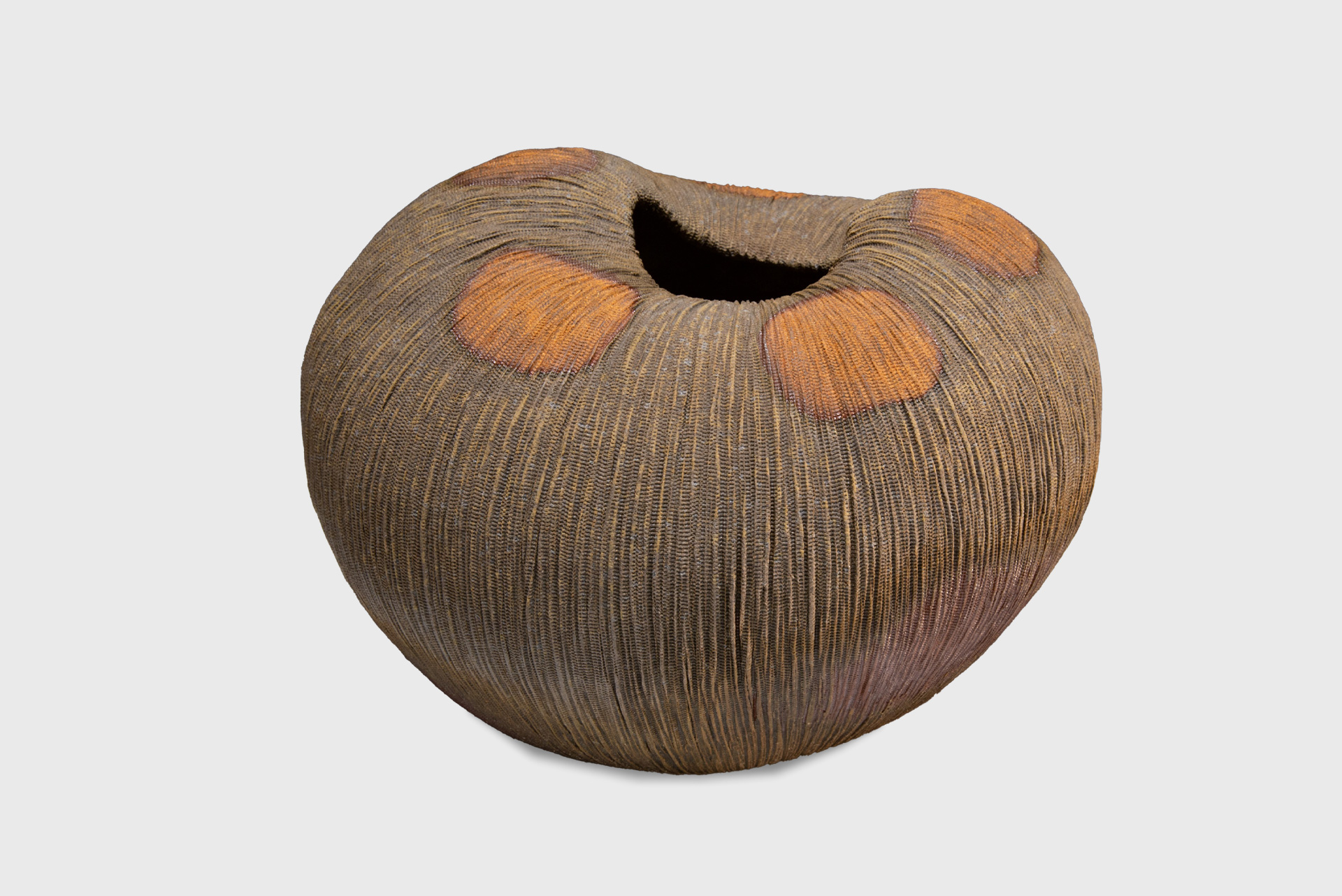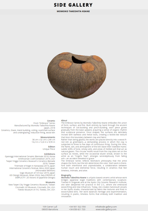 Today, Keane creates her works in a serene studio on the outskirts of Kyoto, adjacent to the garden designed by her husband, landscape architect Marc Peter Keane. Her practice is characterized by hand-built forms using coiling techniques, finished with distinctive fabric-like textures incised into the clay surface. Fired over days in wood-fueled kilns without glaze, her ceramics emerge as singular works that embrace imperfection, chance, and the transformative power of fire.