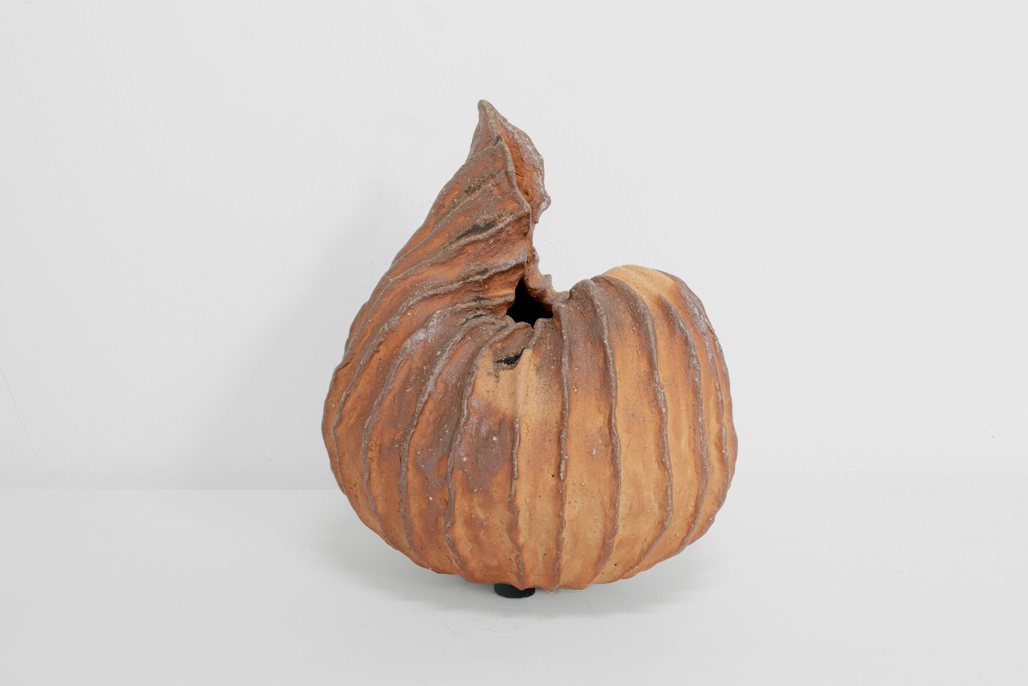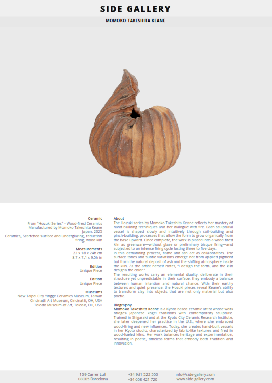 The Hozuki series by Momoko Takeshita Keane reflects her mastery of hand-building techniques and her dialogue with fire. Each sculptural vessel is shaped slowly and intuitively through coil-building and pinch-building, processes that allow the form to grow organically from the base upward. Once complete, the work is placed into a wood-fired kiln as greenware—without glaze or preliminary bisque firing—and subjected to an intense firing cycle lasting three to five days.