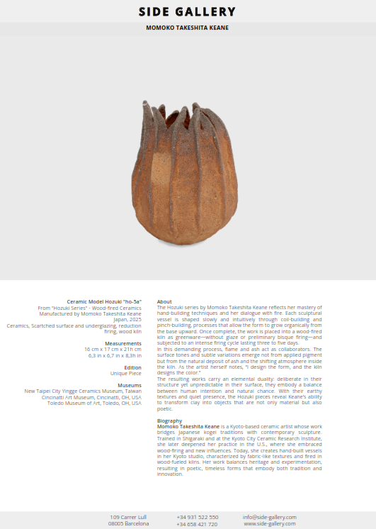 The Hozuki series by Momoko Takeshita Keane reflects her mastery of hand-building techniques and her dialogue with fire. Each sculptural vessel is shaped slowly and intuitively through coil-building and pinch-building, processes that allow the form to grow organically from the base upward. Once complete, the work is placed into a wood-fired kiln as greenware—without glaze or preliminary bisque firing—and subjected to an intense firing cycle lasting three to five days.
