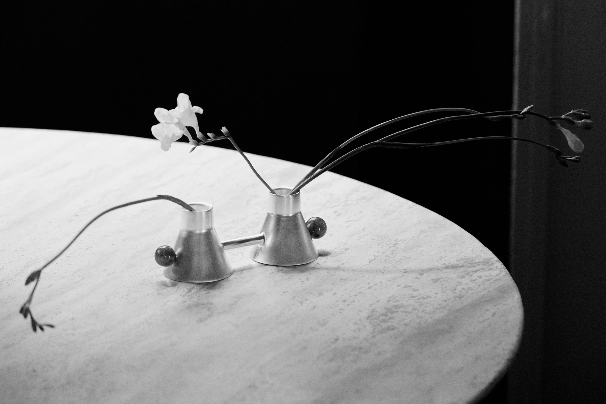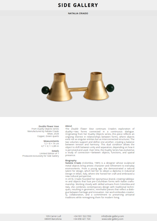 The Double Flower Vase continues Criado’s exploration of duality—two forms connected in a continuous dialogue. Originating from her Duality Objects series, this piece reflects an ongoing interest in relationships between forms, where objects exist not as singular entities but as interconnected structures. The two volumes support and define one another, creating a balance between tension and harmony. This dual condition allows the object to shift between unity and separation, depending on how it is perceived and used. Over time, the Duality Series has evolved as a study of connection—between objects, functions, and spatial presence.