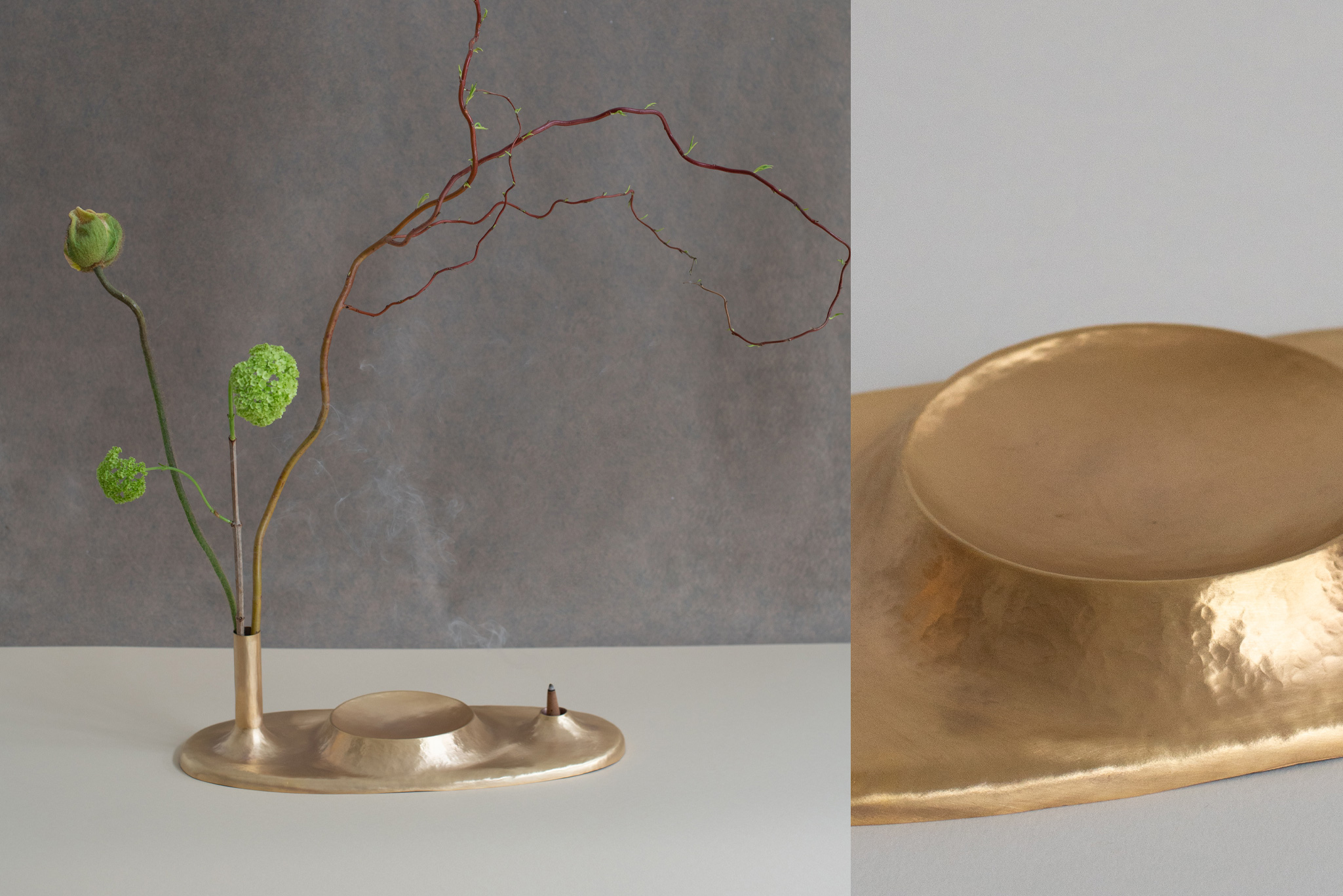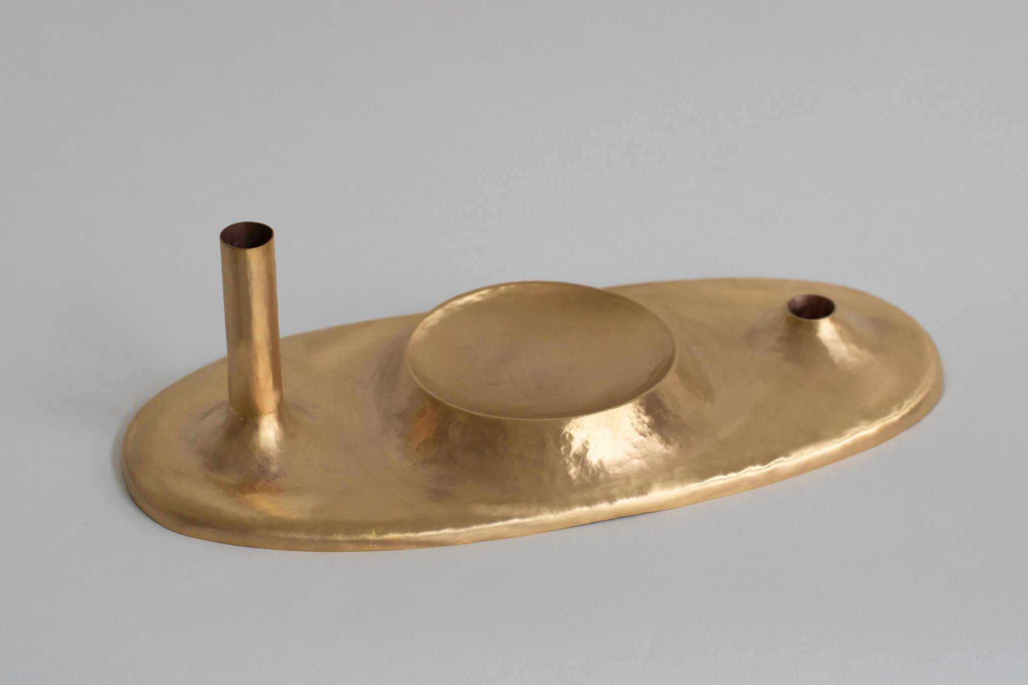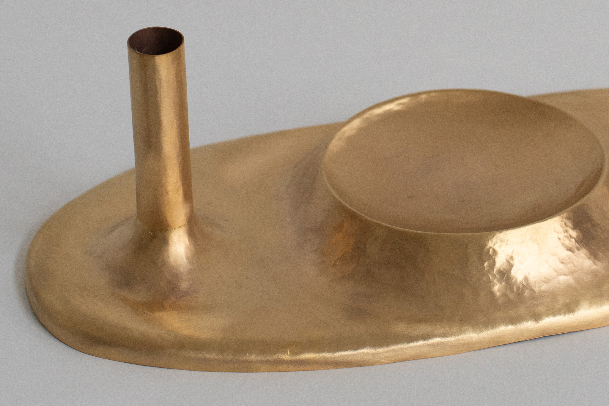 A fruit bowl, flower vase, and candle holder coexist in one unified body—not as fixed functions, but as open possibilities. The object invites interpretation, adapting to different moments and uses around the table. Developed through a hammered technique, the piece allows forms to merge organically. Unlike the rigidity of turned metal, the hammered process enables softer transitions, where each volume appears to grow from the next. The surface retains the marks of its making, creating a subtle, irregular reflection of light that activates the piece even in stillness.