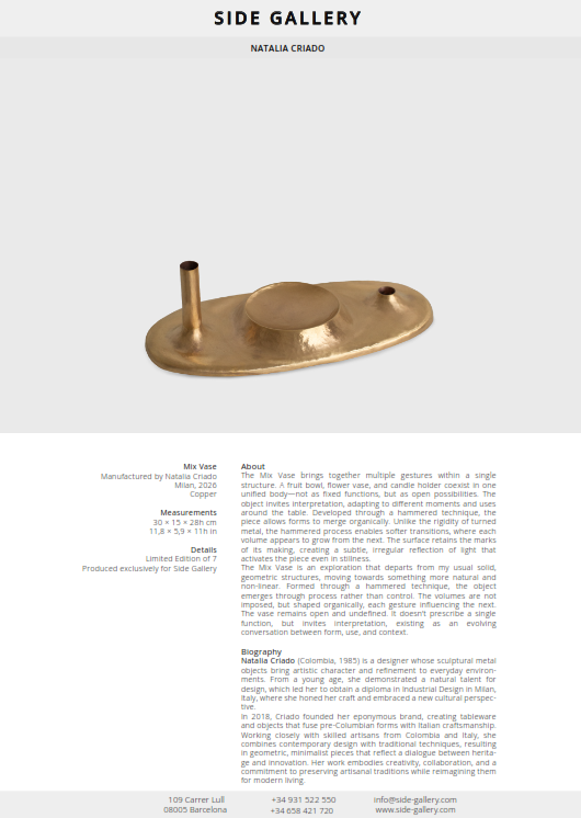 Natalia Criado (Colombia, 1985) is a designer whose sculptural metal objects bring artistic character and refinement to everyday environments. From a young age, she demonstrated a natural talent for design, which led her to obtain a diploma in Industrial Design in Milan, Italy, where she honed her craft and embraced a new cultural perspective.