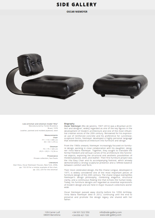 Alan Hess, Oscar Niemeyer Houses, New York, 2006, pp. 132-33 for a similar example of the chair, pp. 222, 225 for the ottoman