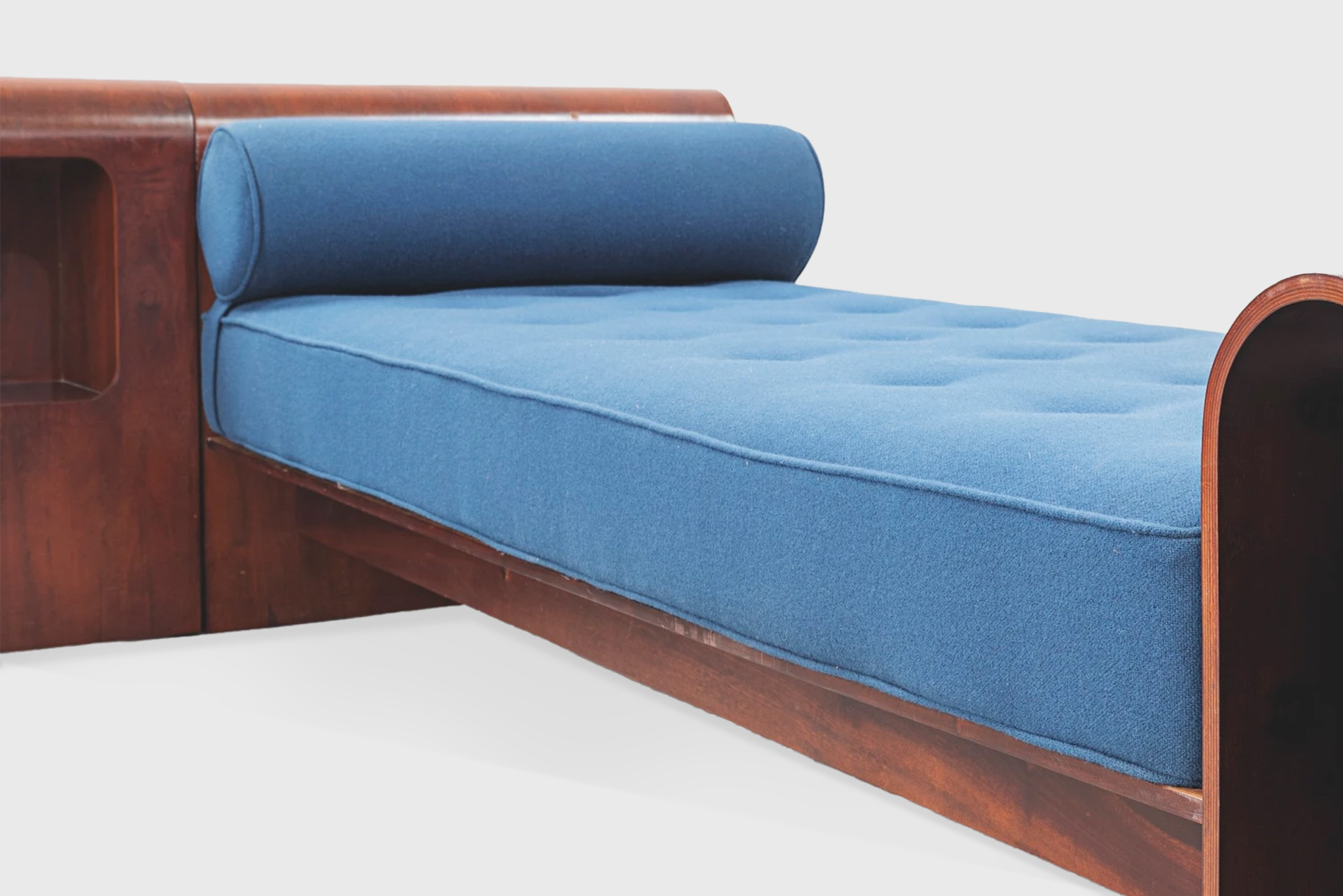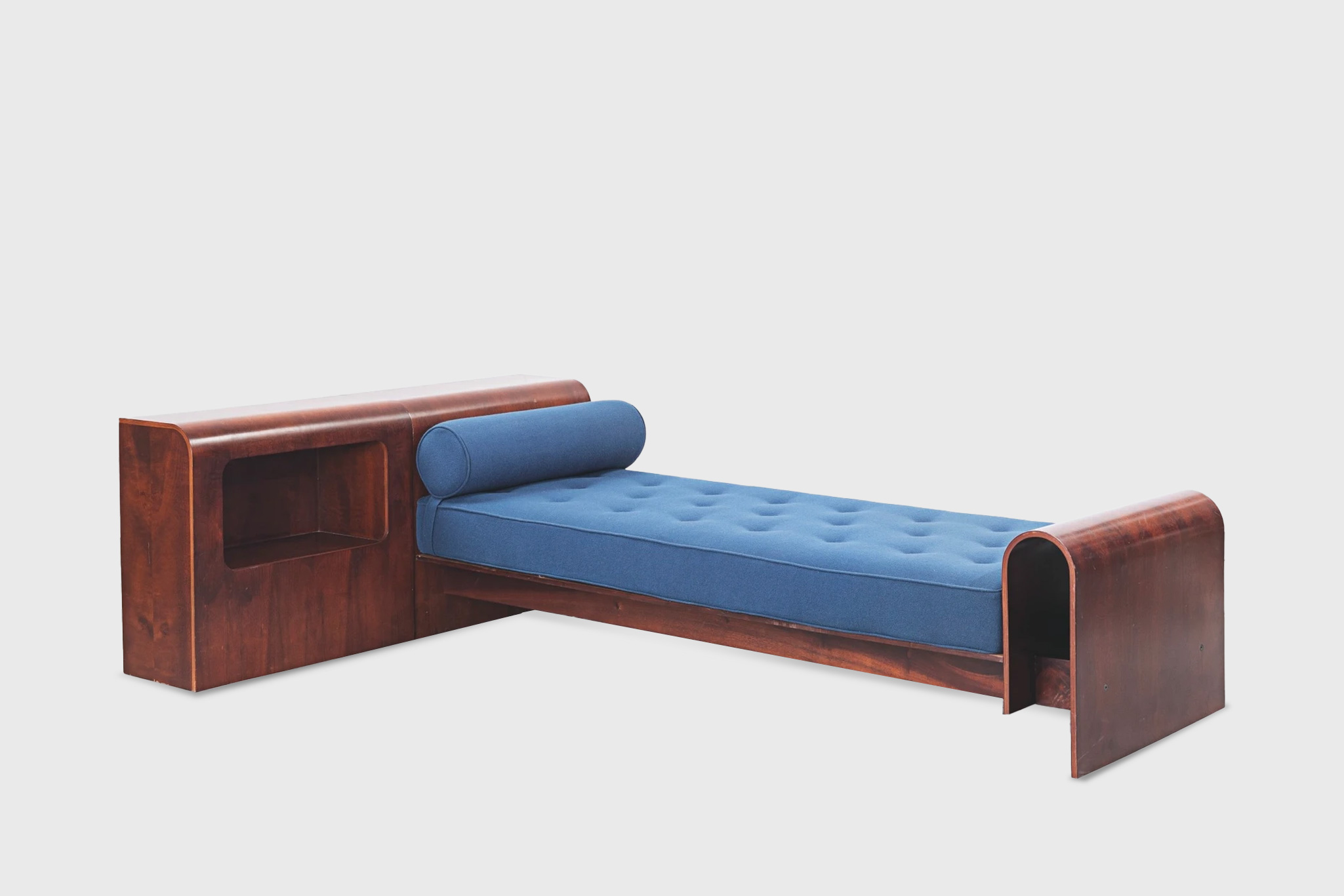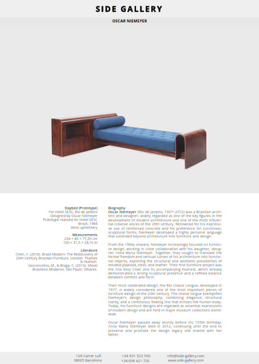 Conceived as a prototype for the Hotel SESC, this daybed reflects Niemeyer’s sculptural sensibility applied to domestic objects. The elongated proportions and low profile echo the horizontality of his architectural work, while the soft wool upholstery contrasts with the rigor of the form.