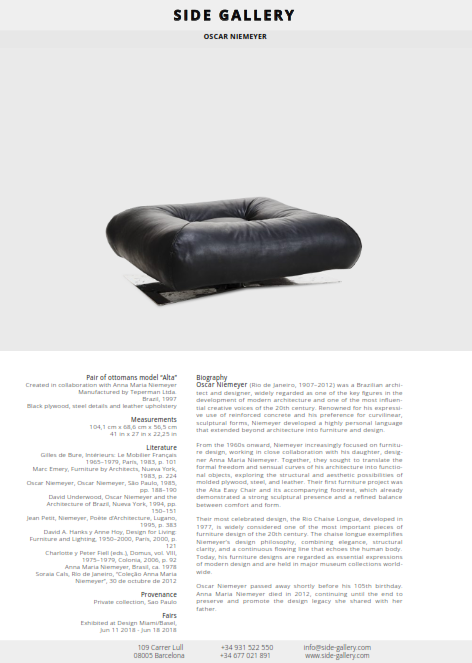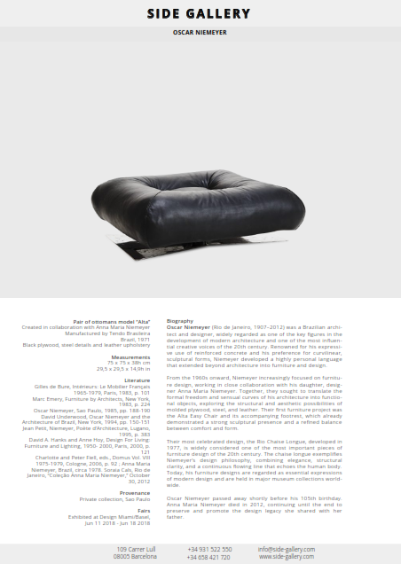 Charlotte and Peter Fiell, eds., Domus Vol. VIII 1975-1979, Cologne, 2006, p. 92 ; Anna Maria Niemeyer, Brazil, circa 1978. Soraia Cals, Rio de Janeiro, “Coleção Anna Maria Niemeyer,” October 30, 2012