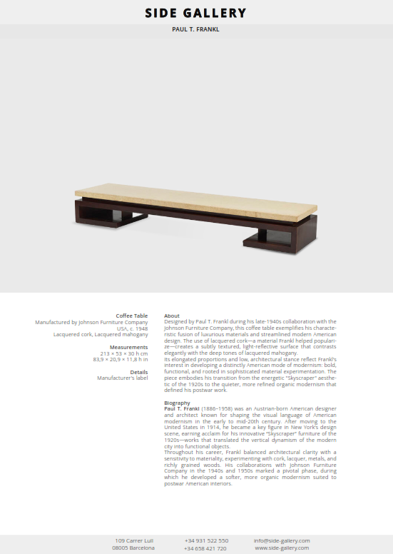 Throughout his career, Frankl balanced architectural clarity with a sensitivity to materiality, experimenting with cork, lacquer, metals, and richly grained woods. His collaborations with Johnson Furniture Company in the 1940s and 1950s marked a pivotal phase, during which he developed a softer, more organic modernism suited to postwar American interiors.