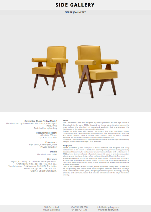 Later in his career he moved to India, where he worked closely with Le Corbusier on the planning and construction of Chandigarh. There he served as the city’s chief architect for several years, designing numerous public buildings, housing projects, and furniture pieces that became emblematic of the city’s modernist identity.