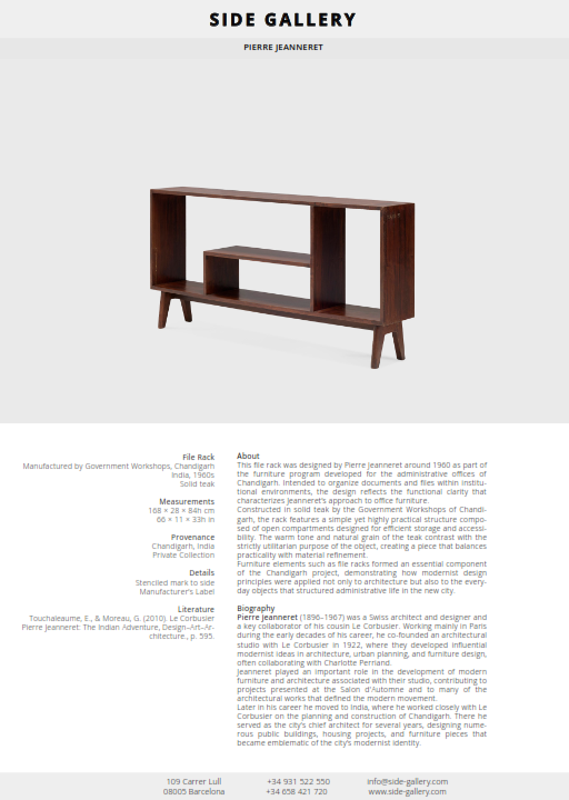 This file rack was designed by Pierre Jeanneret around 1960 as part of the furniture program developed for the administrative offices of Chandigarh. Intended to organize documents and files within institutional environments, the design reflects the functional clarity that characterizes Jeanneret’s approach to office furniture.