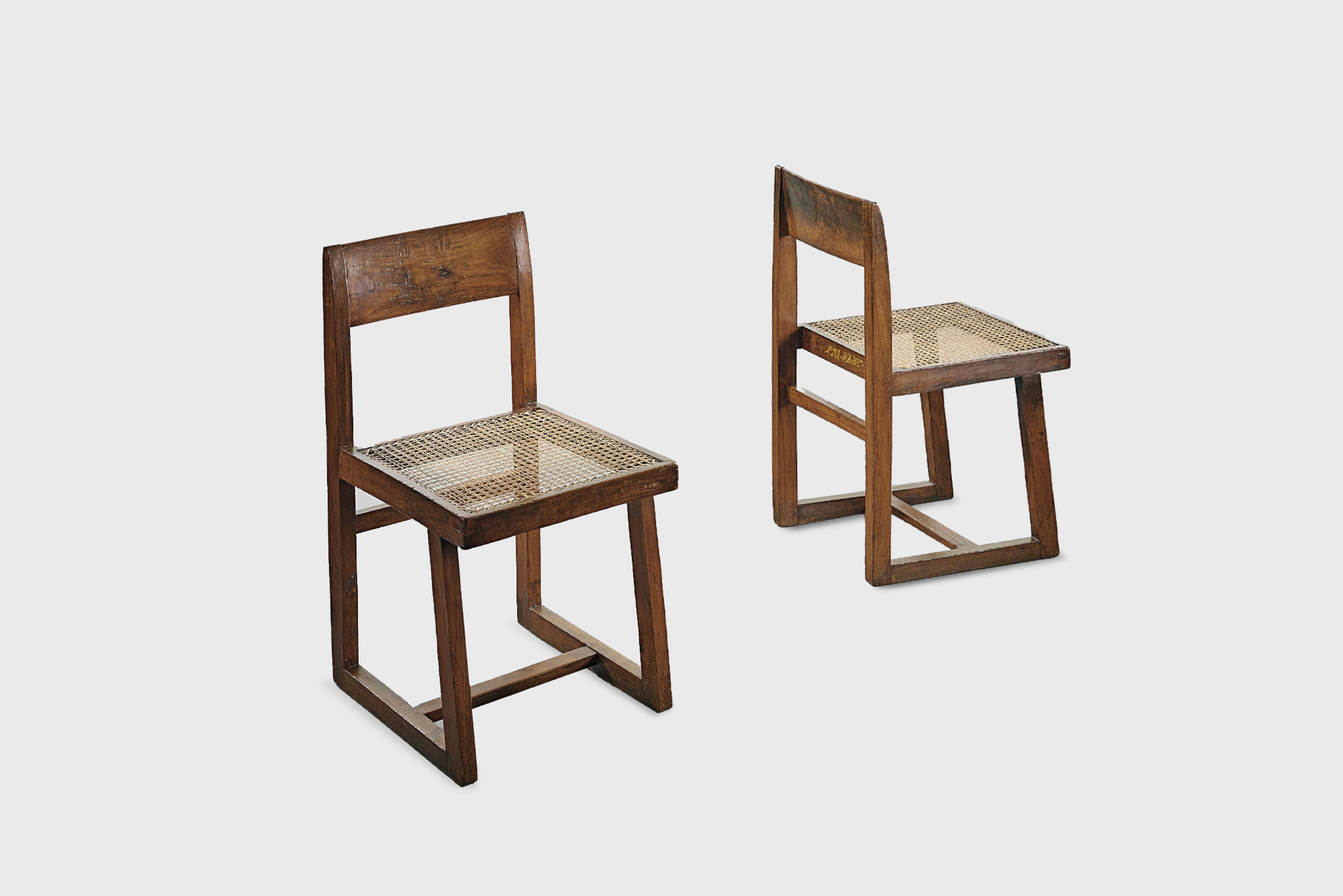 These chairs are part of the seating furniture created for residential and institutional interiors in Chandigarh around 1960.