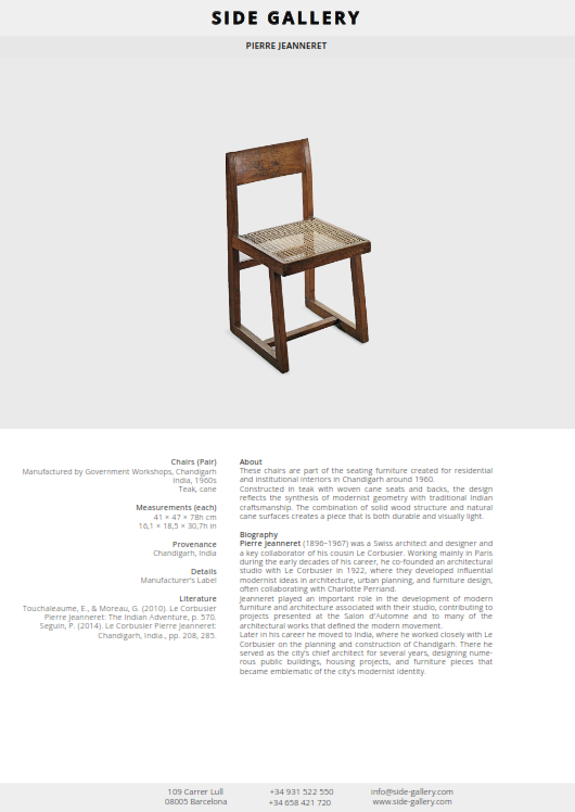 Later in his career he moved to India, where he worked closely with Le Corbusier on the planning and construction of Chandigarh. There he served as the city’s chief architect for several years, designing numerous public buildings, housing projects, and furniture pieces that became emblematic of the city’s modernist identity.