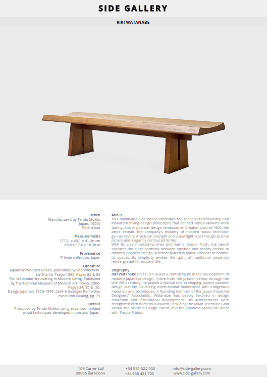 Riki Watanabe (1911–2013) was a central figure in the development of modern Japanese design. Active from the prewar period through the late 20th century, he played a pivotal role in shaping Japan’s postwar design identity, balancing international modernism with indigenous materials and techniques. A founding member of the Japan Industrial Designers’ Association, Watanabe was deeply involved in design education and institutional development. His achievements were recognized with numerous awards, including the Milan Triennale Gold Medal, the Mainichi Design Award, and the Japanese Medal of Honor with Purple Ribbon.