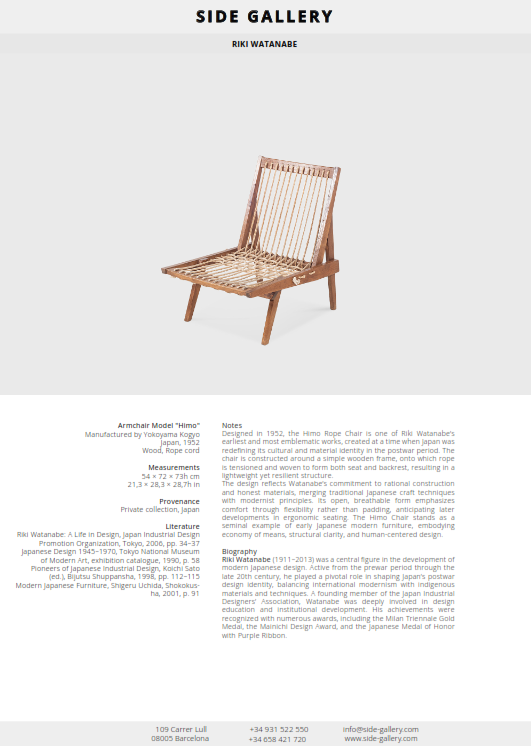 The design reflects Watanabe’s commitment to rational construction and honest materials, merging traditional Japanese craft techniques with modernist principles. Its open, breathable form emphasizes comfort through flexibility rather than padding, anticipating later developments in ergonomic seating. The Himo Chair stands as a seminal example of early Japanese modern furniture, embodying economy of means, structural clarity, and human-centered design.