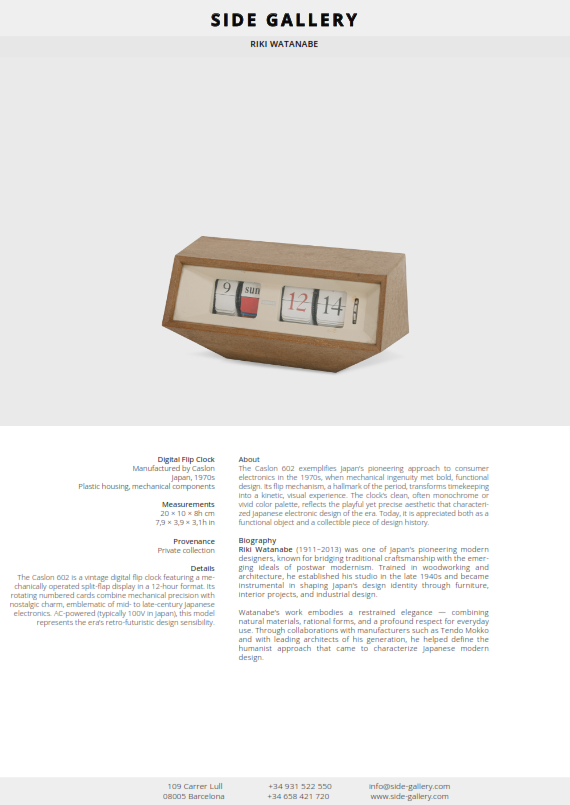 The Caslon 602 exemplifies Japan’s pioneering approach to consumer electronics in the 1970s, when mechanical ingenuity met bold, functional design. Its flip mechanism, a hallmark of the period, transforms timekeeping into a kinetic, visual experience. The clock’s clean, often monochrome or vivid color palette, reflects the playful yet precise aesthetic that characterized Japanese electronic design of the era. Today, it is appreciated both as a functional object and a collectible piece of design history.