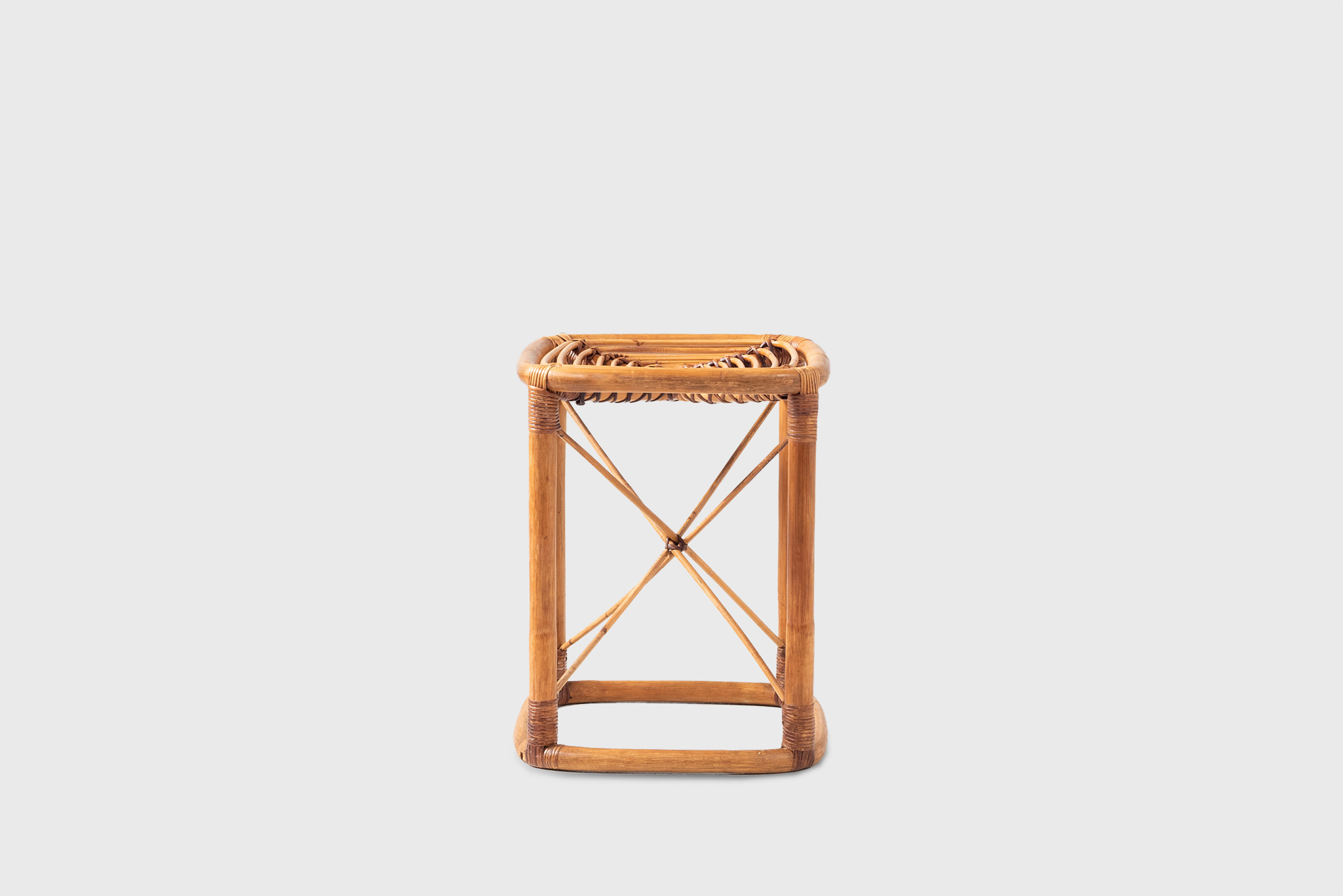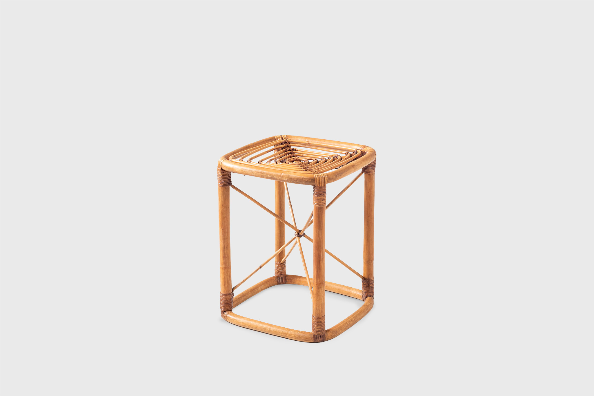 This stool, designed by Riki Watanabe in the 1960s, showcases his skill in combining traditional Japanese materials with modern design sensibilities. Made entirely of rattan, the piece demonstrates lightweight construction, natural textures, and functional simplicity. Watanabe, a leading figure in postwar Japanese design, explored the use of organic materials in everyday furniture, bridging artisanal craftsmanship with modernist principles.