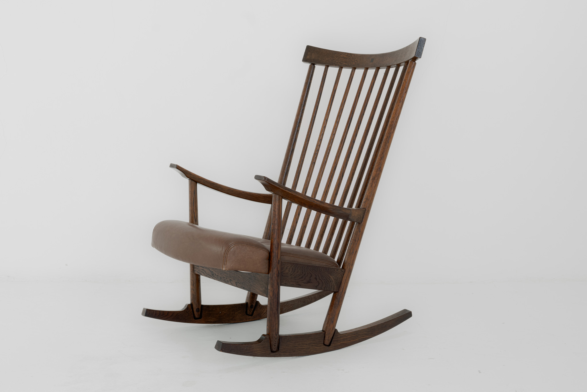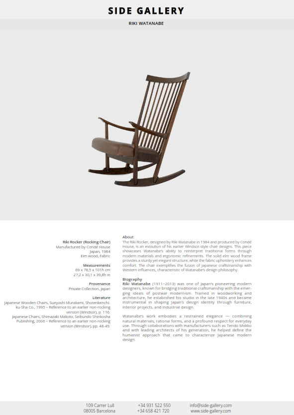 The Riki Rocker, designed by Riki Watanabe in 1984 and produced by Condé House, is an evolution of his earlier Windsor-style chair designs. This piece showcases Watanabe’s ability to reinterpret traditional forms through modern materials and ergonomic refinements. The solid elm wood frame provides a sturdy yet elegant structure, while the fabric upholstery enhances comfort. The chair exemplifies the fusion of Japanese craftsmanship with Western influences, characteristic of Watanabe’s design philosophy.