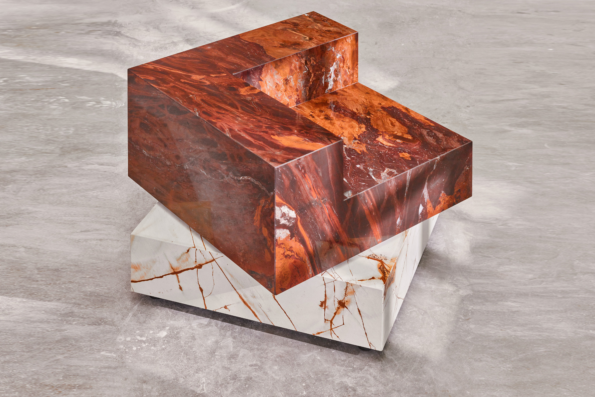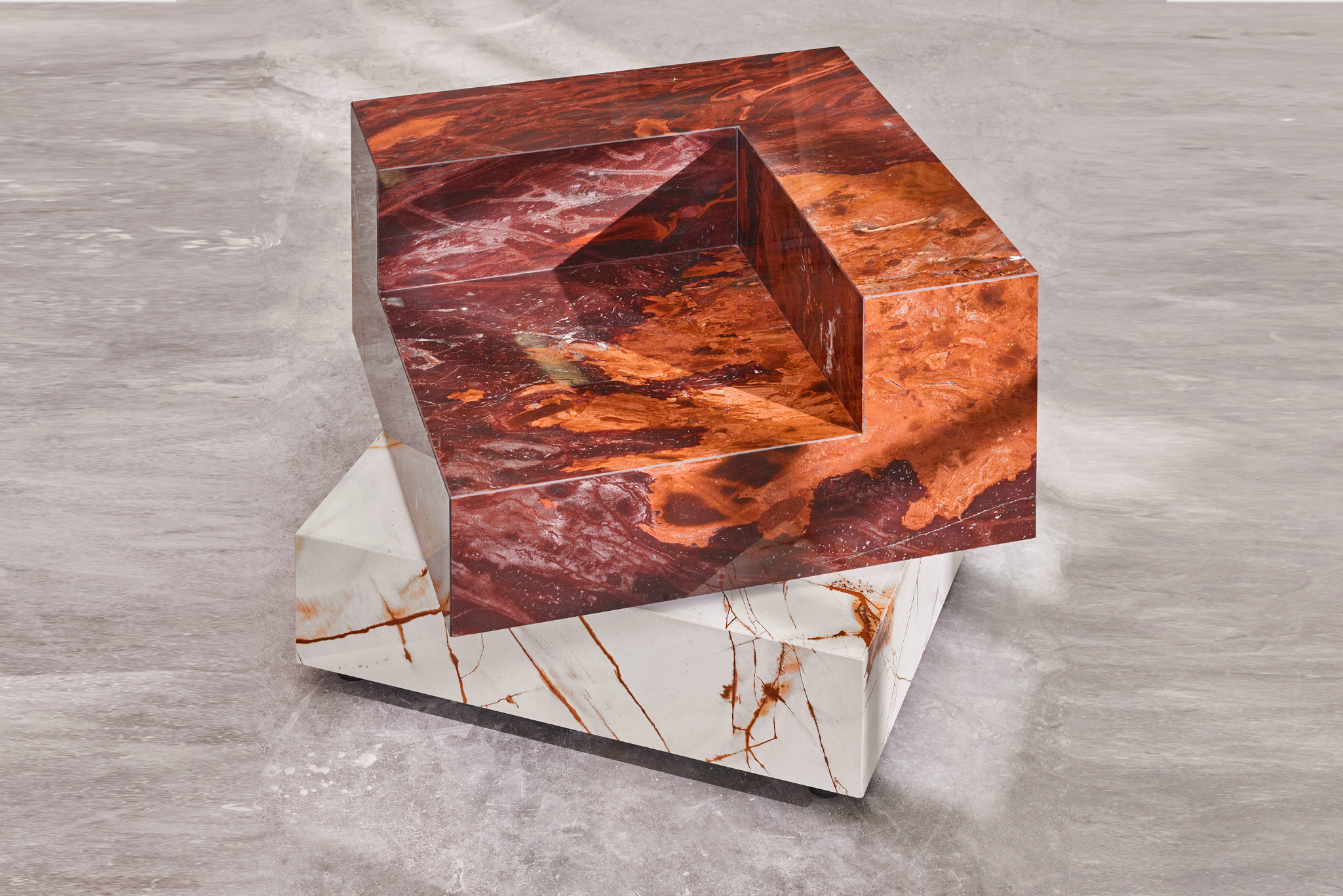Over the last decade, the award-winning designer has become known for her work with resin and glass. Her receptiveness for these two materials is due to their manipulability; sharp angular shapes as well as spineless curves can be protracted giving the artist endless scope for form. Moreover, the translucency of the both materials can be adjusted from sheer transparency to milky or solid opaque finishes. Working in collaboration with industry specialists, Marcelis intervenes in the manufacturing processes using material research and experimentation to achieve new and surprising visual effects, applying a strong aesthetic point of you to the material development processes. The series Candy Cubes is an example of the designer’s complex material investigation; a polyester resin mold is used to cast the piece, followed by an intensive polishing process. The cast resin is light sensitive, as sun rays shine down onto the solid blocks, the light illuminates the edges, sugar coating the sides, making the aptly named “marshmallow” colored candy cube appear edible.