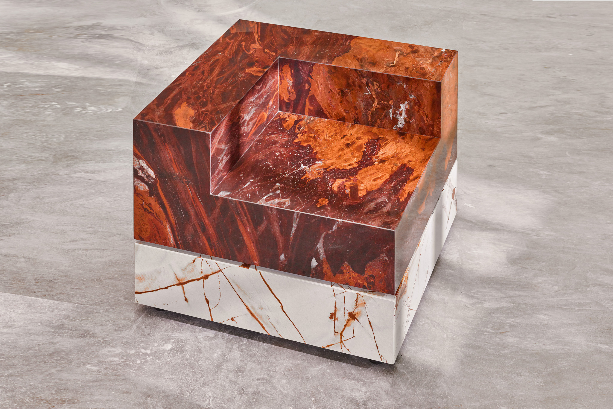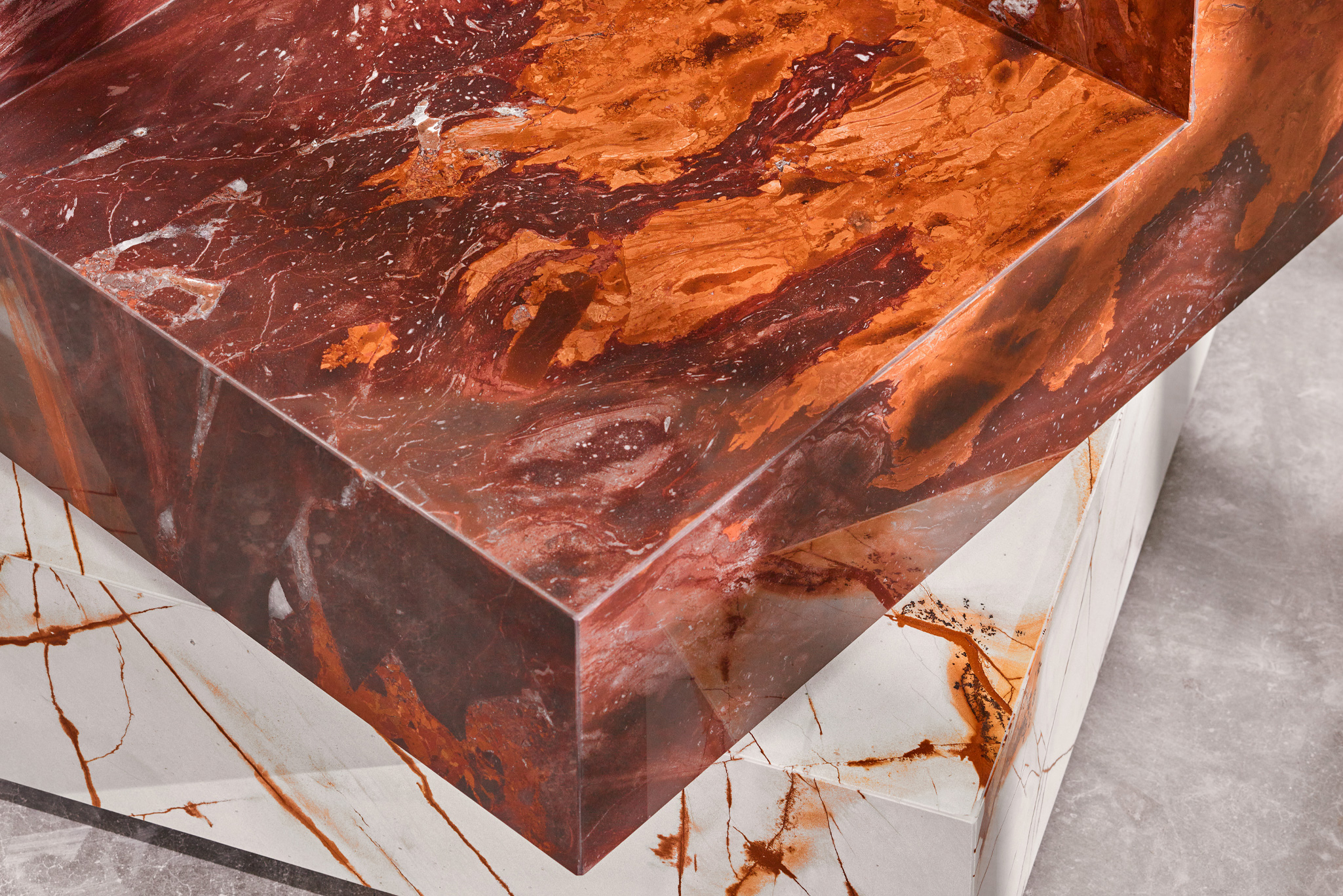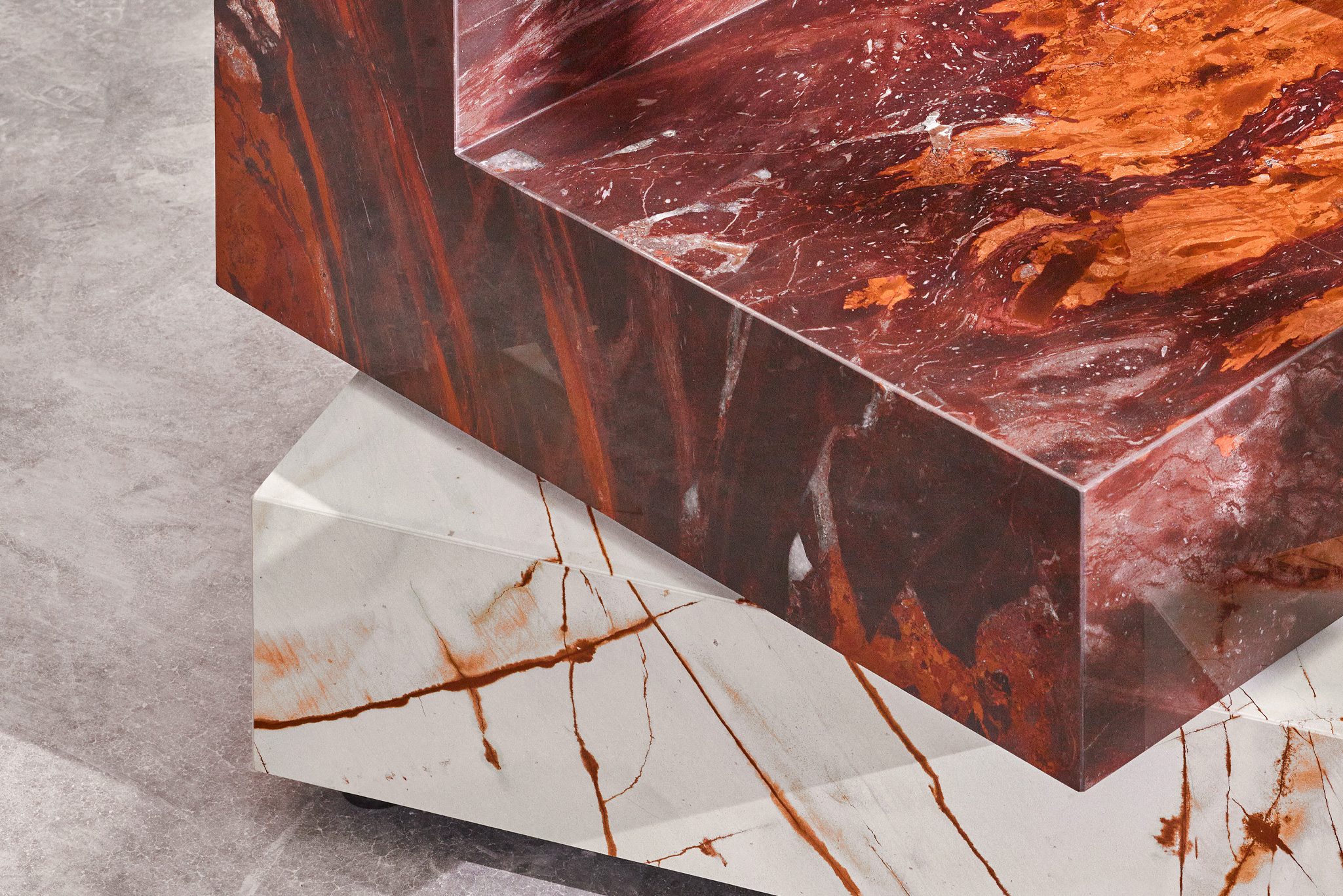 The Swivel Series by Sabine Marcelis showcases her exploration of natural stone through a carefully selected range from SolidNature, including Stormy Glacier Marble, Orchidea Marble, Sunflower Onyx, and Kamilia Rose Marble. Each piece features a layered stone base, where two rotating levels reveal shifting patterns and hues, creating a dynamic sense of movement and visual intrigue. The subtle rotation transforms both chairs and tables into sculptural objects that continually change perspective, offering new angles and experiences with every interaction. The Swivel Table, with its off-centre rotation, provides an added element of surprise, making it a captivating focal point for any environment. Designed for versatility, these pieces are suitable for both indoor and outdoor settings, redefining contemporary stone furniture.