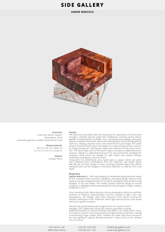 Produced in the Netherlands, every Swivel piece is unique. Clients can select their preferred stone combinations from the collection, and Studio Sabine Marcelis will craft each design to order, ensuring a bespoke object that reflects individual taste and the designer’s meticulous attention to material, form, and detail.