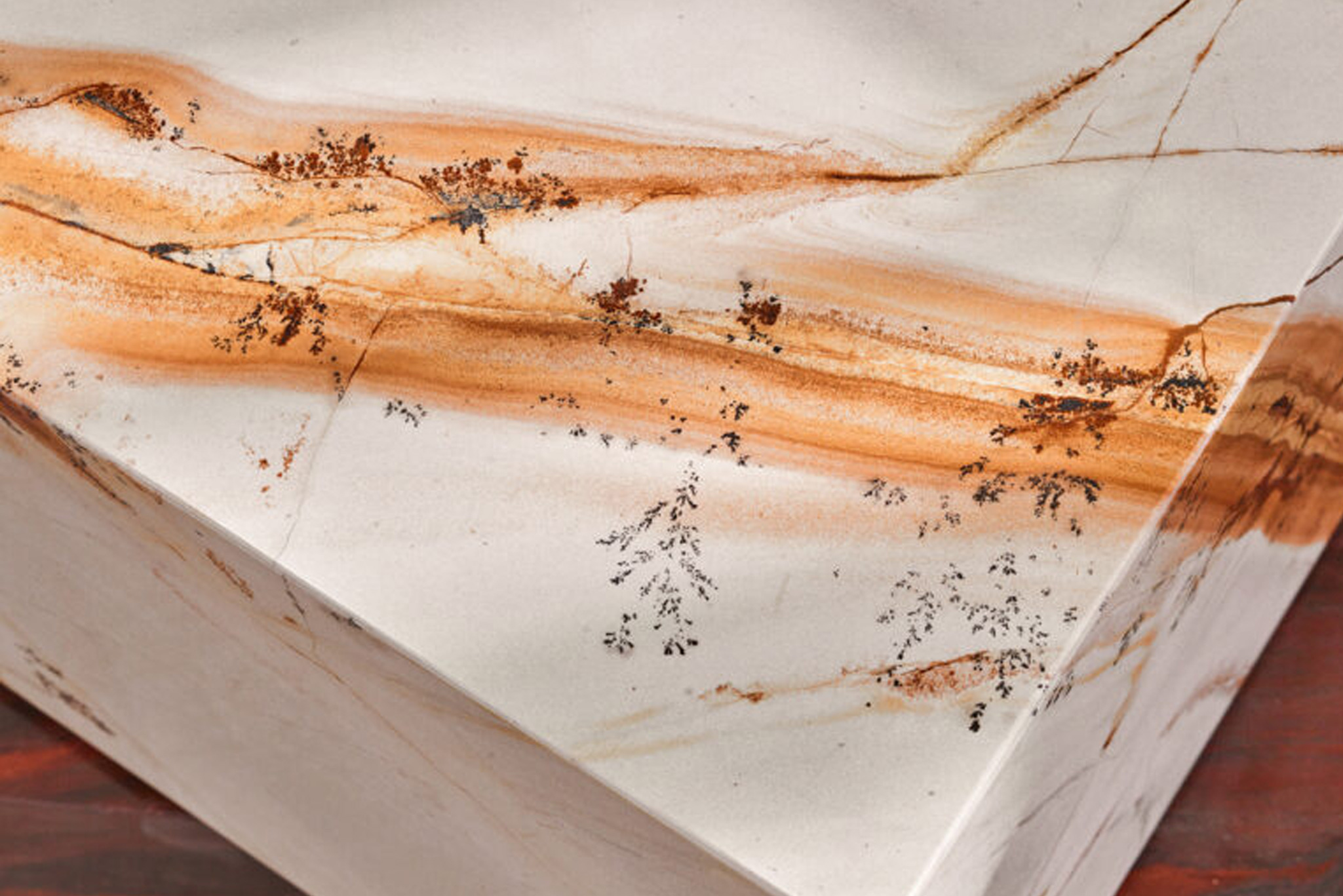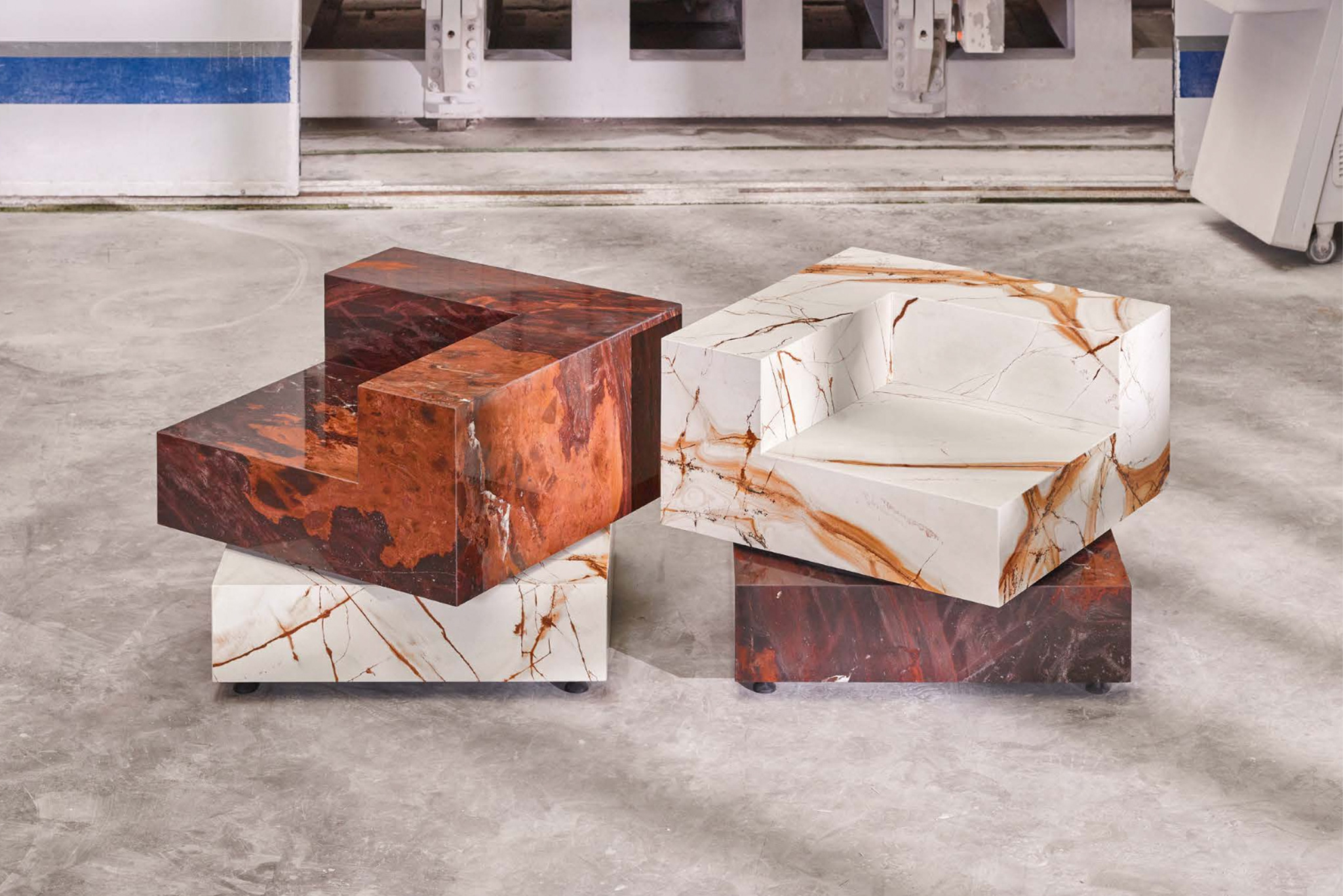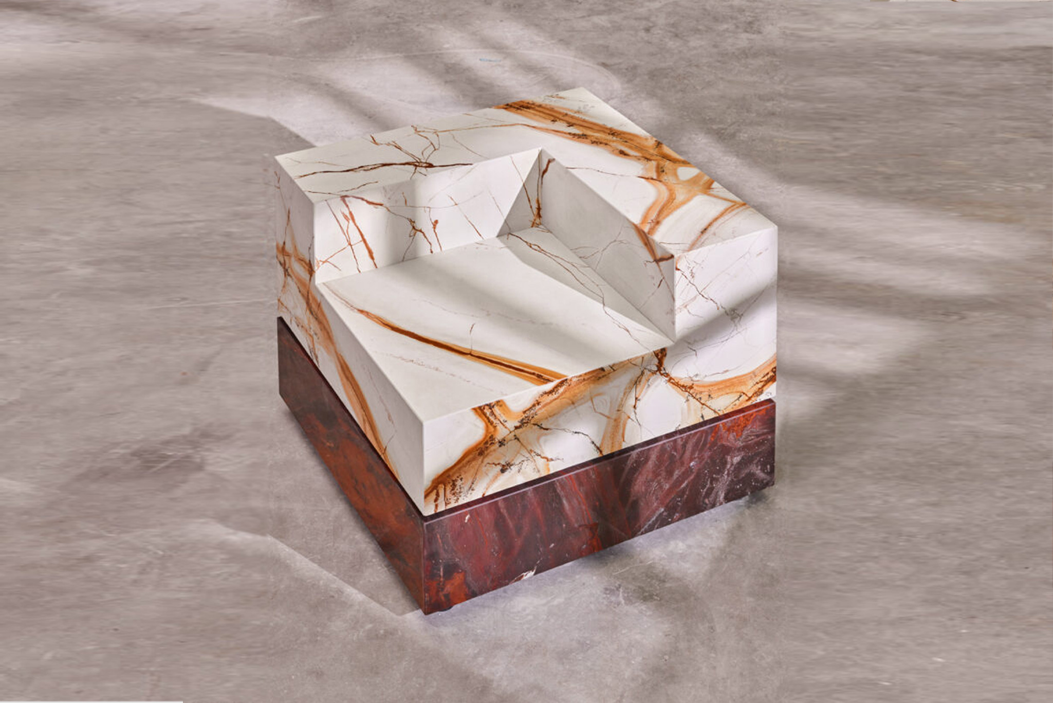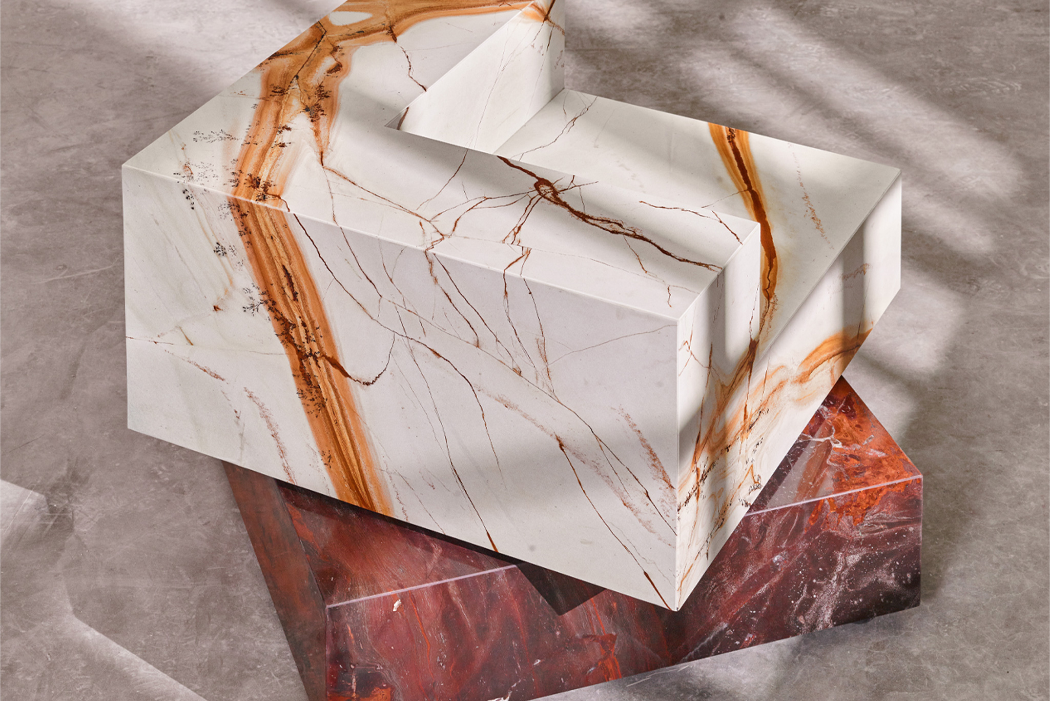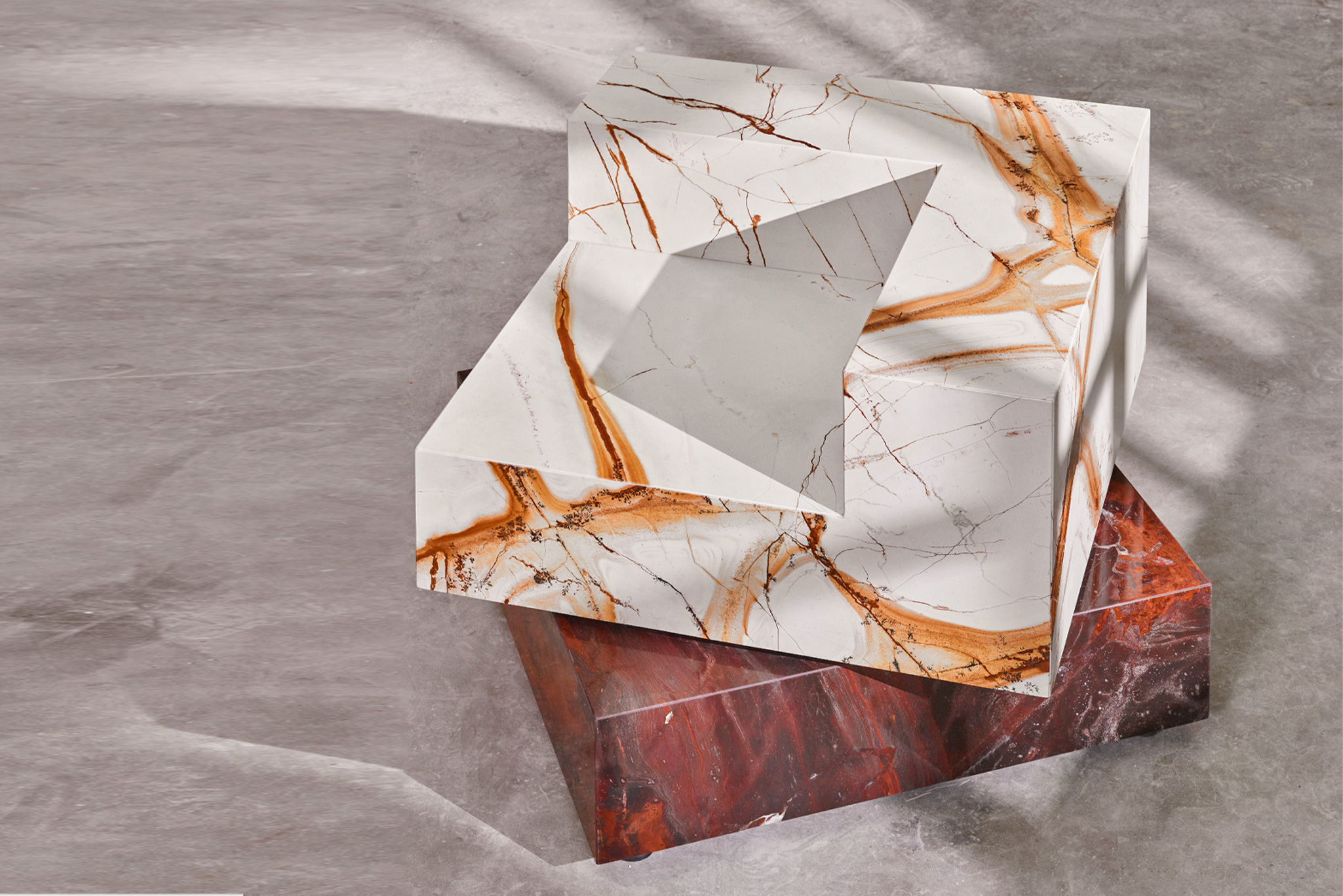 Over the last decade, the award-winning designer has become known for her work with resin and glass. Her receptiveness for these two materials is due to their manipulability; sharp angular shapes as well as spineless curves can be protracted giving the artist endless scope for form. Moreover, the translucency of the both materials can be adjusted from sheer transparency to milky or solid opaque finishes. Working in collaboration with industry specialists, Marcelis intervenes in the manufacturing processes using material research and experimentation to achieve new and surprising visual effects, applying a strong aesthetic point of you to the material development processes. The series Candy Cubes is an example of the designer’s complex material investigation; a polyester resin mold is used to cast the piece, followed by an intensive polishing process. The cast resin is light sensitive, as sun rays shine down onto the solid blocks, the light illuminates the edges, sugar coating the sides, making the aptly named “marshmallow” colored candy cube appear edible.