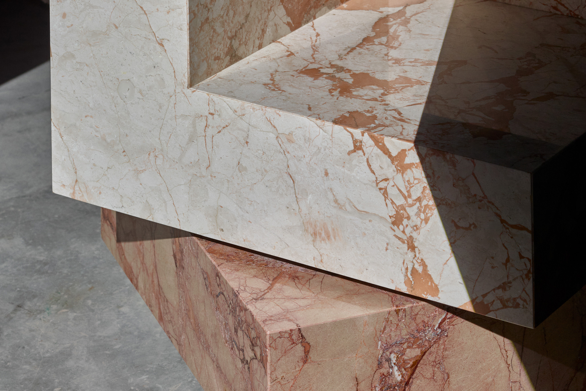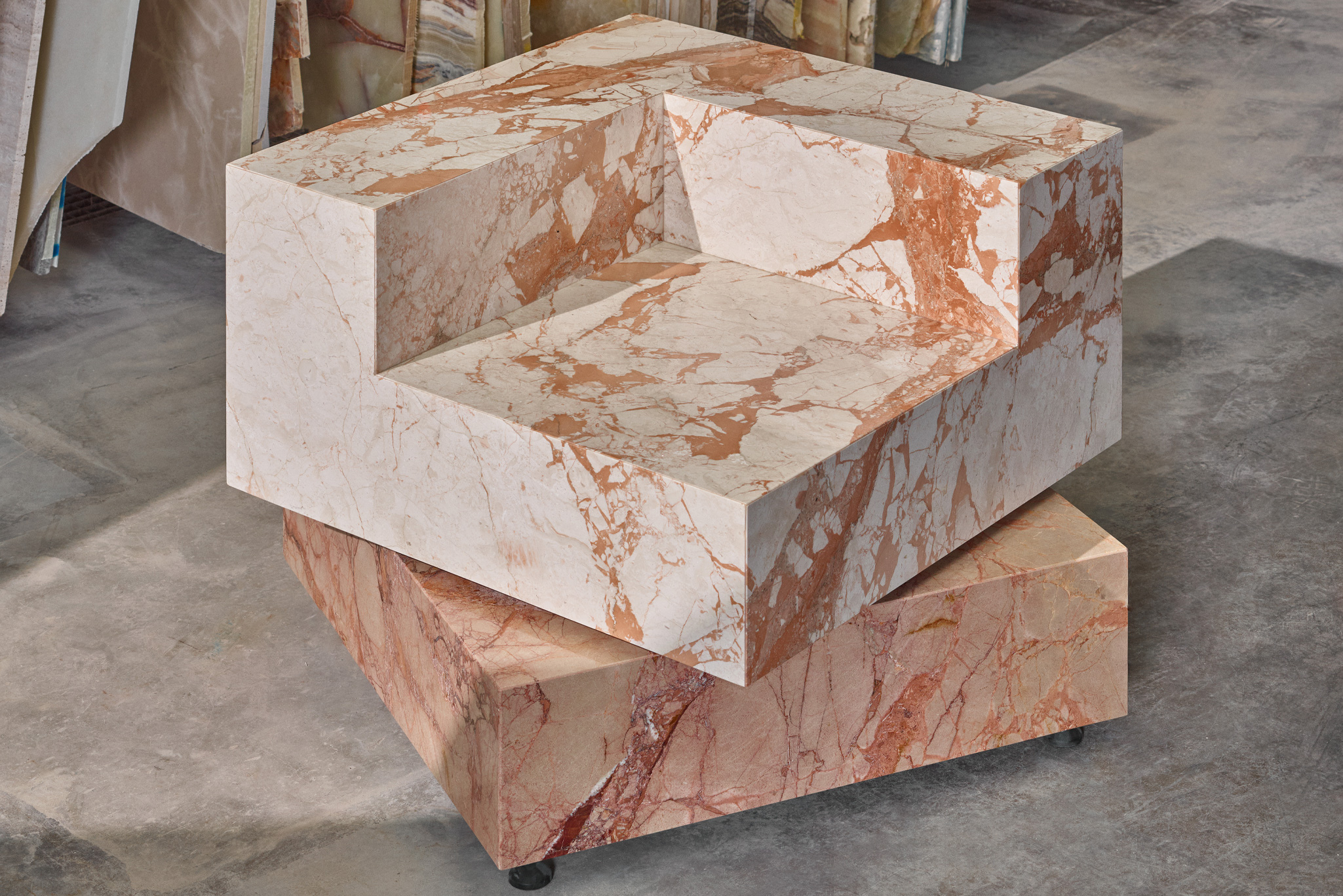 The Swivel Series by Sabine Marcelis showcases her exploration of natural stone through a carefully selected range from SolidNature, including Stormy Glacier Marble, Orchidea Marble, Sunflower Onyx, and Kamilia Rose Marble. Each piece features a layered stone base, where two rotating levels reveal shifting patterns and hues, creating a dynamic sense of movement and visual intrigue. The subtle rotation transforms both chairs and tables into sculptural objects that continually change perspective, offering new angles and experiences with every interaction. The Swivel Table, with its off-centre rotation, provides an added element of surprise, making it a captivating focal point for any environment. Designed for versatility, these pieces are suitable for both indoor and outdoor settings, redefining contemporary stone furniture.