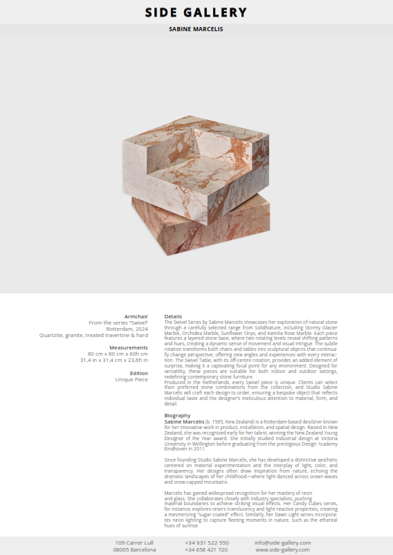 Produced in the Netherlands, every Swivel piece is unique. Clients can select their preferred stone combinations from the collection, and Studio Sabine Marcelis will craft each design to order, ensuring a bespoke object that reflects individual taste and the designer’s meticulous attention to material, form, and detail.