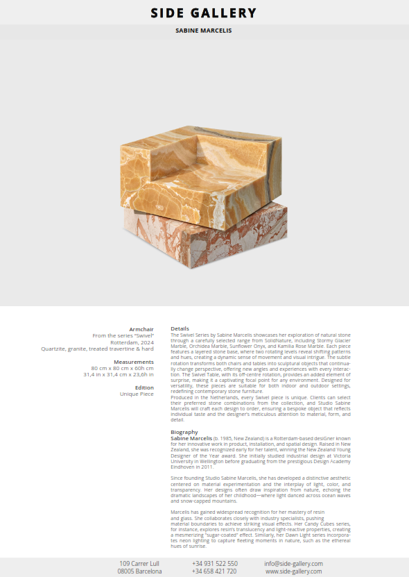 Produced in the Netherlands, every Swivel piece is unique. Clients can select their preferred stone combinations from the collection, and Studio Sabine Marcelis will craft each design to order, ensuring a bespoke object that reflects individual taste and the designer’s meticulous attention to material, form, and detail.