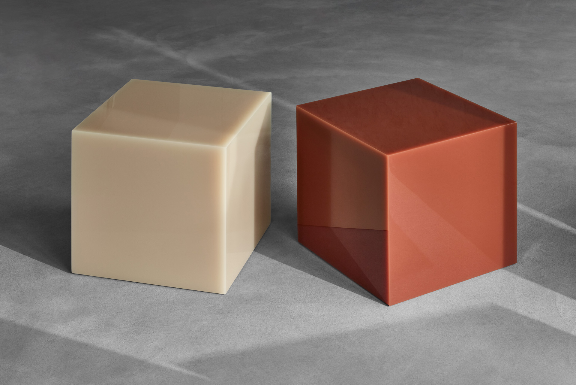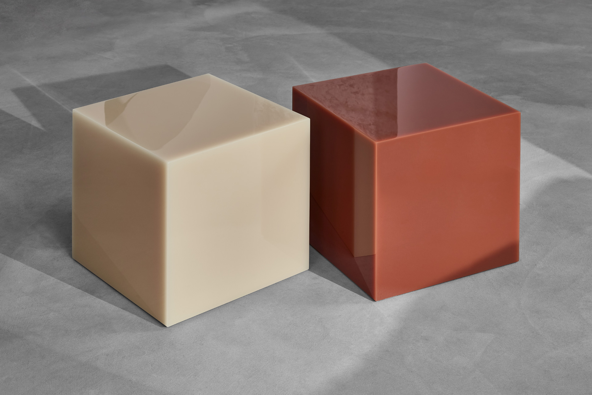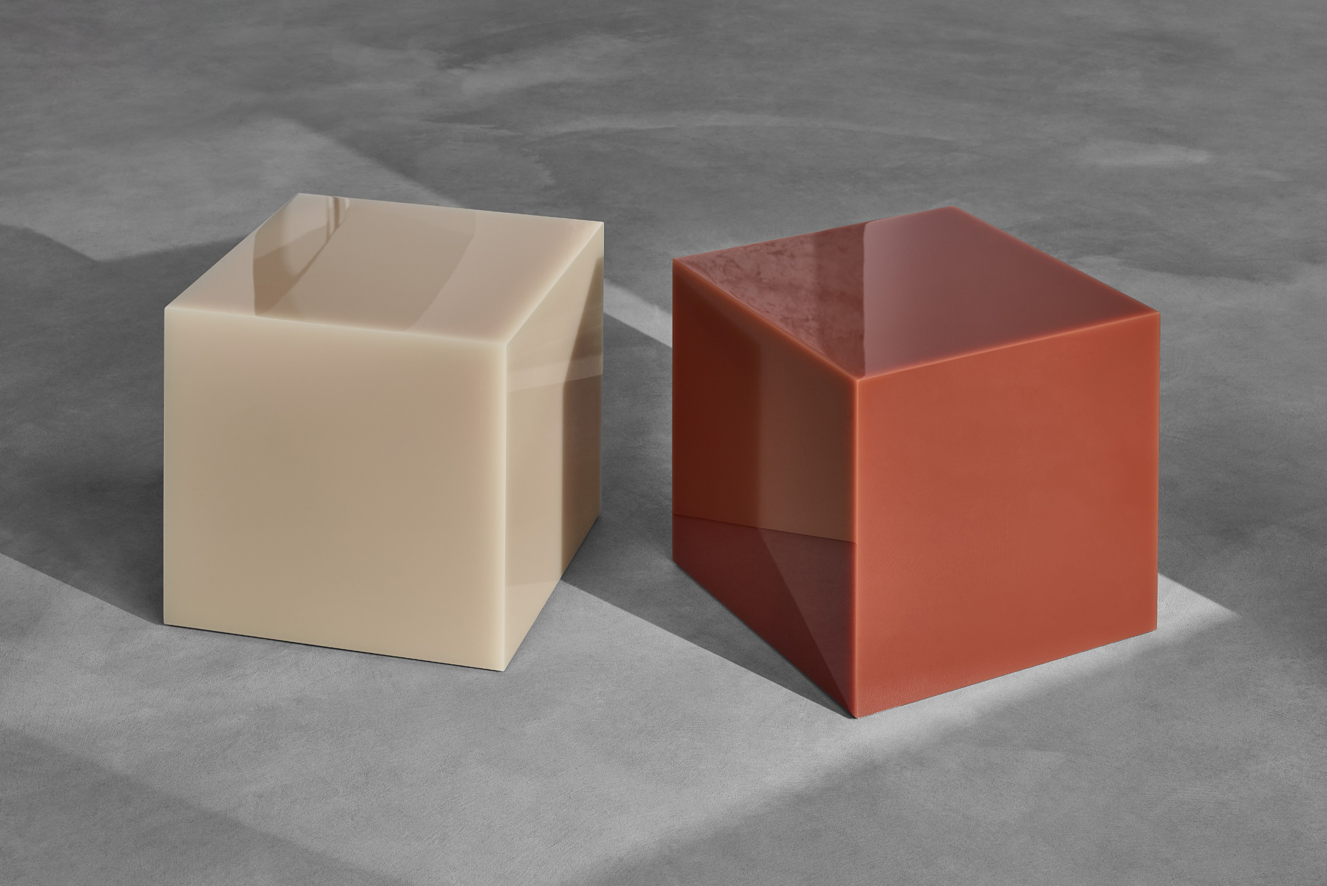 Over the last decade, the award-winning designer has become known for her work with resin and glass. Her receptiveness for these two materials is due to their manipulability; sharp angular shapes as well as spineless curves can be protracted giving the artist endless scope for form. Moreover, the translucency of the both materials can be adjusted from sheer transparency to milky or solid opaque finishes. Working in collaboration with industry specialists, Marcelis intervenes in the manufacturing processes using material research and experimentation to achieve new and surprising visual effects, applying a strong aesthetic point of you to the material development processes. The series Candy Cubes is an example of the designer’s complex material investigation; a polyester resin mold is used to cast the piece, followed by an intensive polishing process. The cast resin is light sensitive, as sun rays shine down onto the solid blocks, the light illuminates the edges, sugar coating the sides, making the aptly named “marshmallow” colored candy cube appear edible.