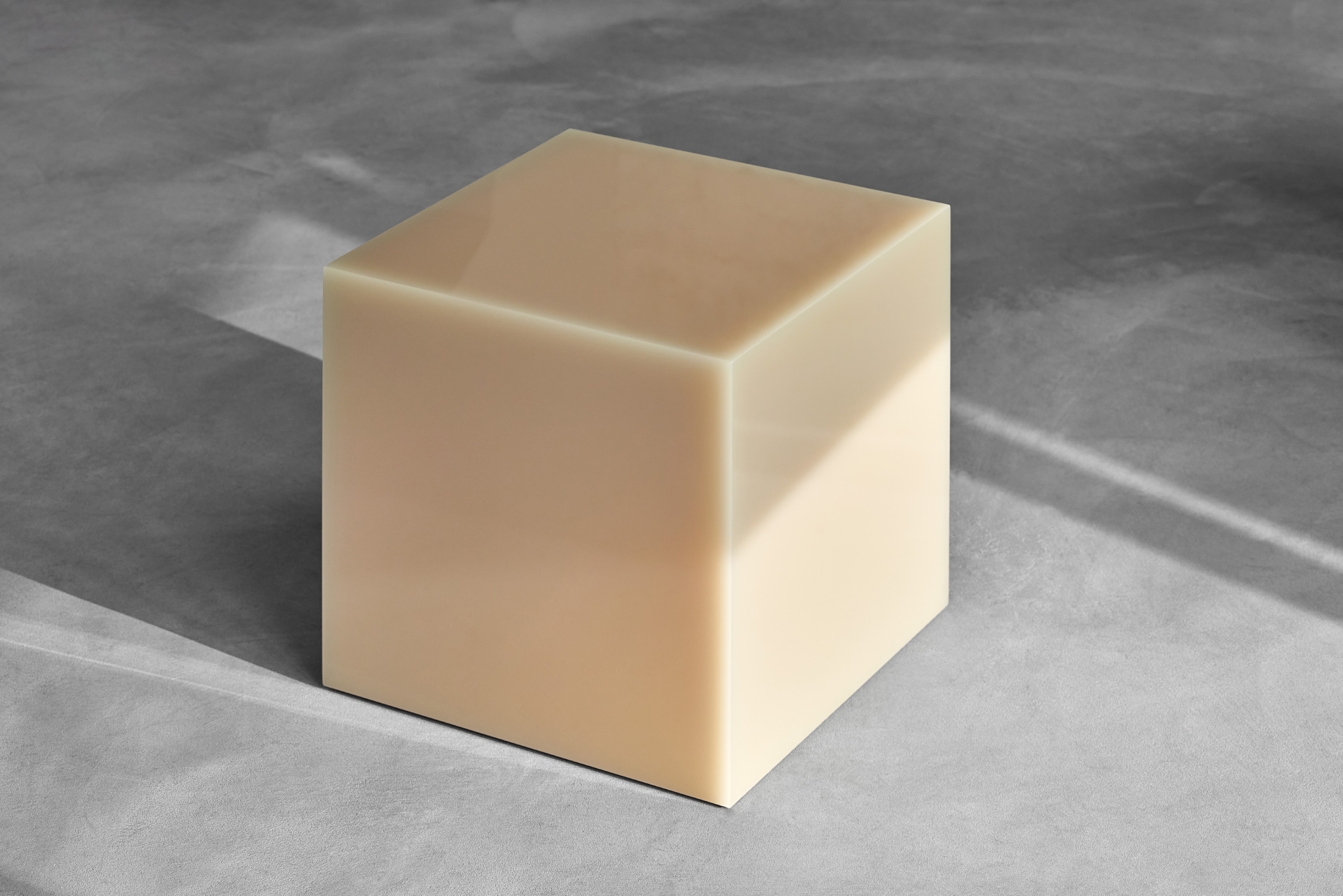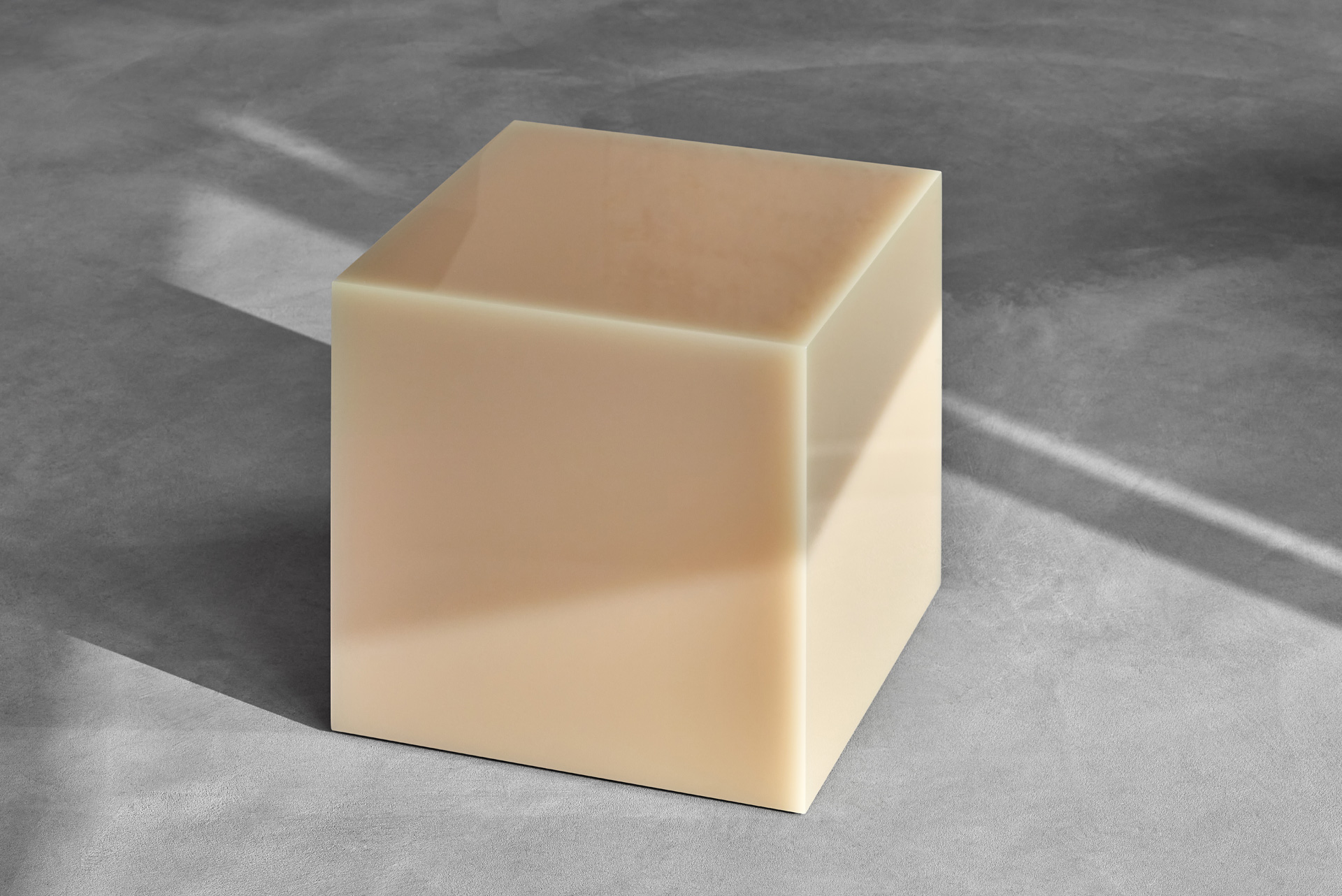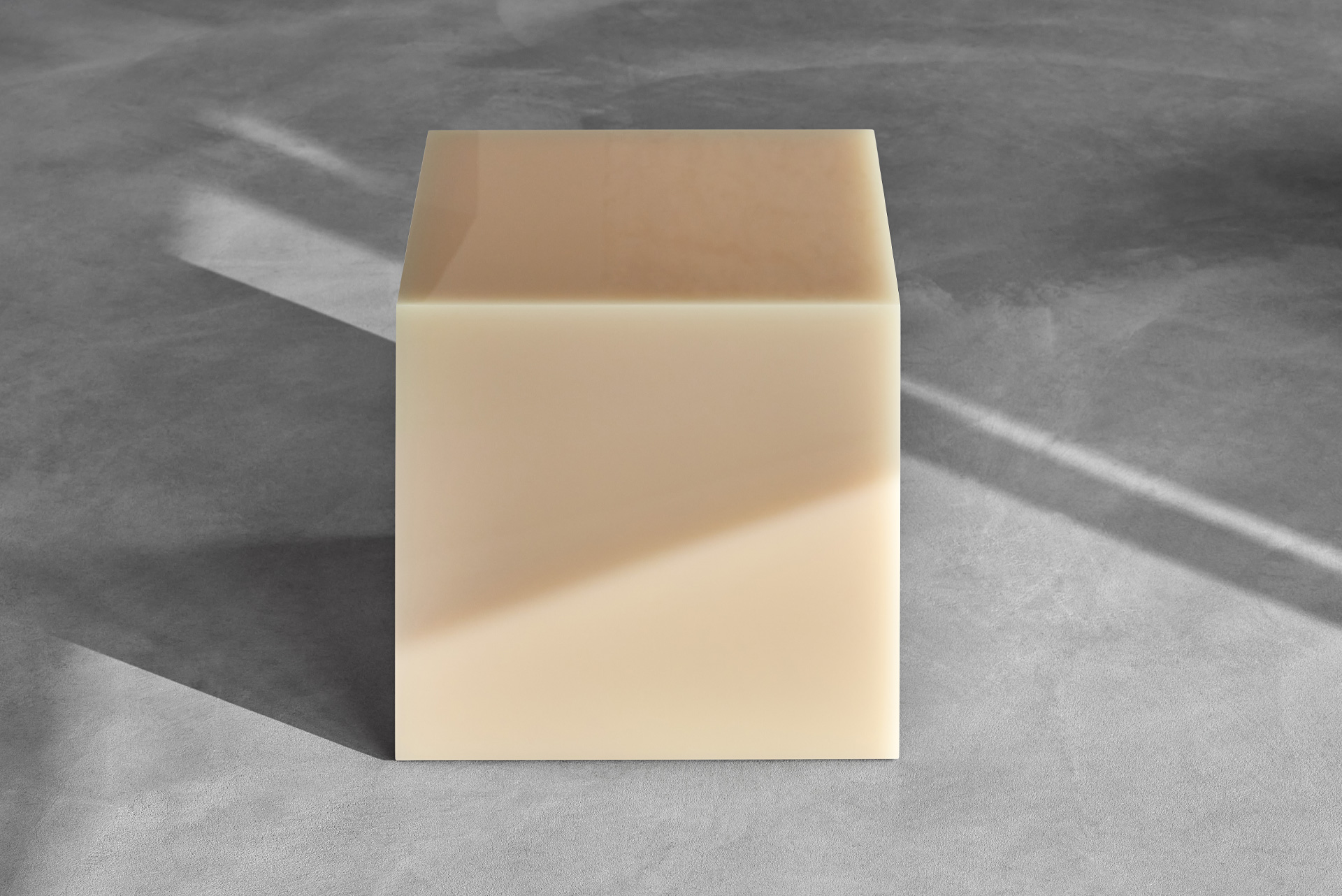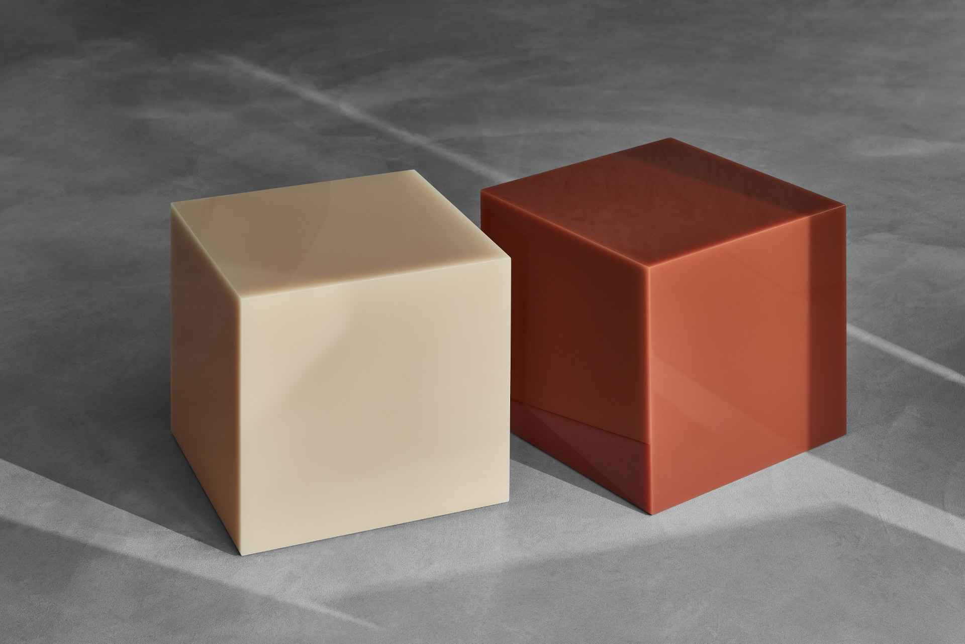 Over the last decade, the award-winning designer has become known for her work with resin and glass. Her receptiveness for these two materials is due to their manipulability; sharp angular shapes as well as spineless curves can be protracted giving the artist endless scope for form. Moreover, the translucency of the both materials can be adjusted from sheer transparency to milky or solid opaque finishes. Working in collaboration with industry specialists, Marcelis intervenes in the manufacturing processes using material research and experimentation to achieve new and surprising visual effects, applying a strong aesthetic point of you to the material development processes. The series Candy Cubes is an example of the designer’s complex material investigation; a polyester resin mold is used to cast the piece, followed by an intensive polishing process. The cast resin is light sensitive, as sun rays shine down onto the solid blocks, the light illuminates the edges, sugar coating the sides, making the aptly named “marshmallow” colored candy cube appear edible.