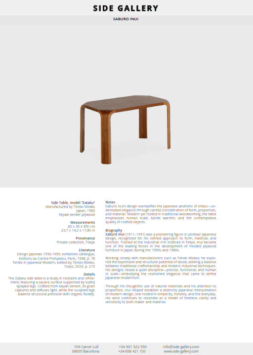 Collaborating closely with Tendo Mokko, a pioneering manufacturer known for its partnerships with architects such as Sori Yanagi and Kenzo Tange, Inui helped define a new direction in postwar Japanese furniture: democratic, elegant, and technically refined. His work continues to be collected internationally and serves as a key reference in the study of 20th-century Japanese design.