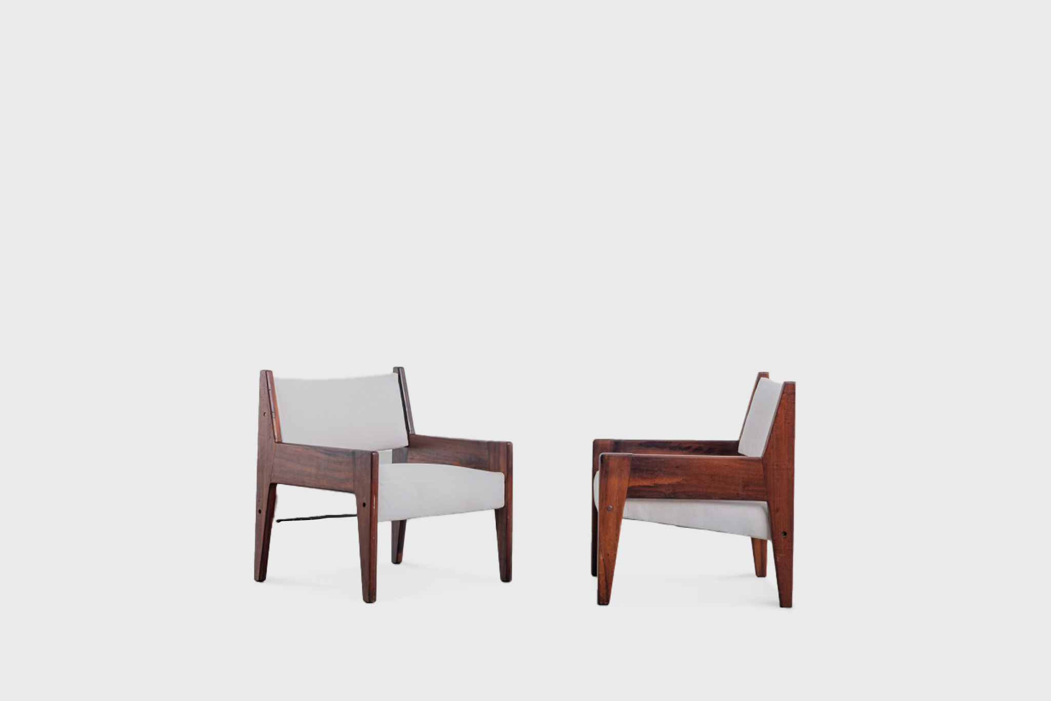 The CD-7, or Lucio Costa chair, was made of solid wood with straw seat and named after the architect, a great promoter of Rodrigues' work. The PL-7Jockey PL-7Jockey, or Oscar Niemeyer armchair, was also constructed with a wooden frame. This chair has braided straw arms carved as unique pieces, with an anatomical design, and constructed through thoughtful consideration of Lucio Costa's work. However, influences from the works of the Danish architect and designer Finn Juhl (1912-1989) can also be seen in the design.