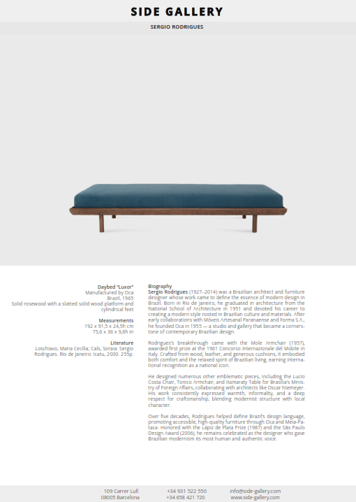 Along with essential furniture designers in Brazil, such as Joaquim Tenreiro, and Zanine Caldas, Sergio Rodrigues has played a decisive role in the history of Brazilian furniture. He is the author of various works and always developed furniture consistent with the evolution of architecture during his life.