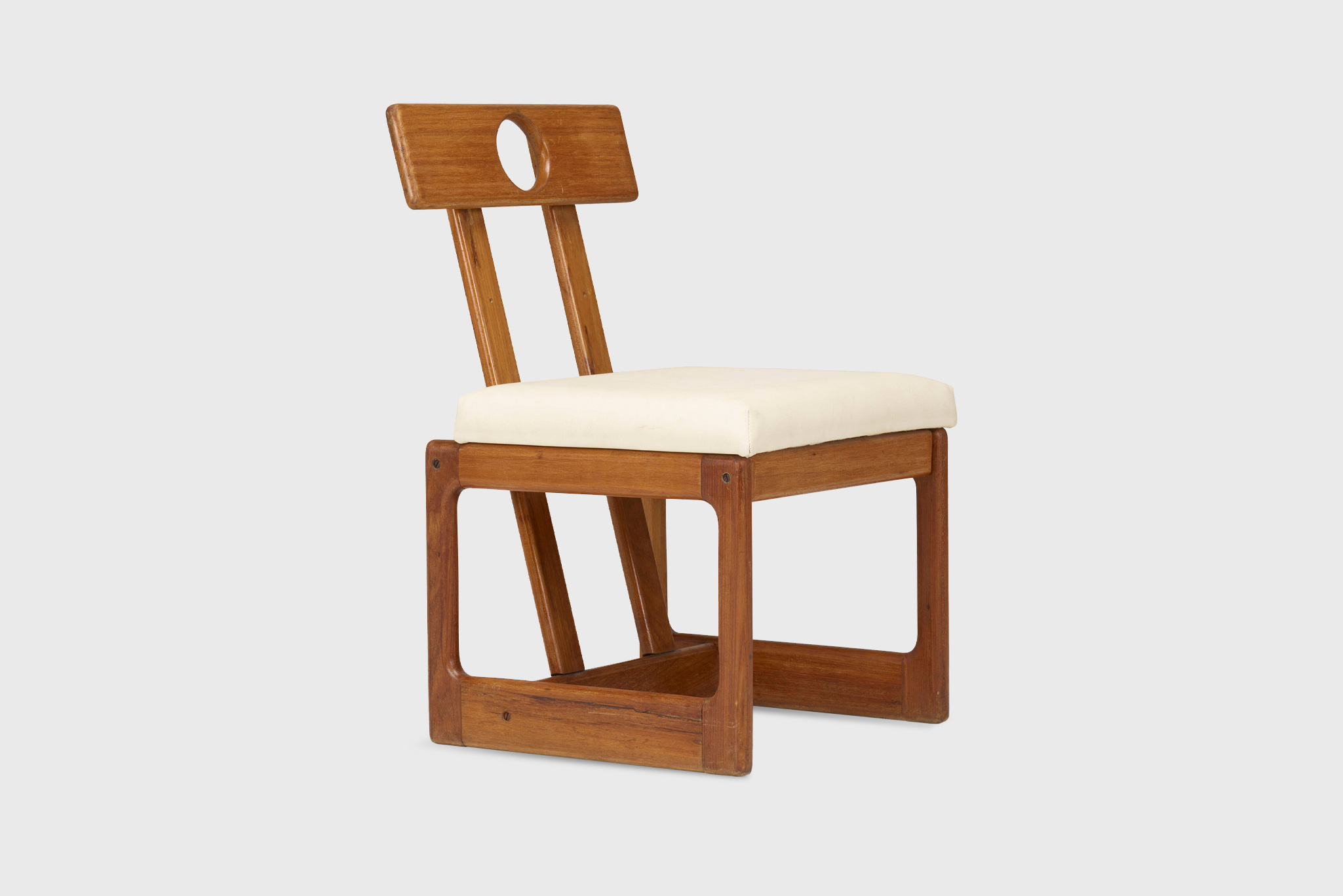 The CD-7, or Lucio Costa chair, was made of solid wood with straw seat and named after the architect, a great promoter of Rodrigues' work. The PL-7Jockey PL-7Jockey, or Oscar Niemeyer armchair, was also constructed with a wooden frame. This chair has braided straw arms carved as unique pieces, with an anatomical design, and constructed through thoughtful consideration of Lucio Costa's work. However, influences from the works of the Danish architect and designer Finn Juhl (1912-1989) can also be seen in the design.
