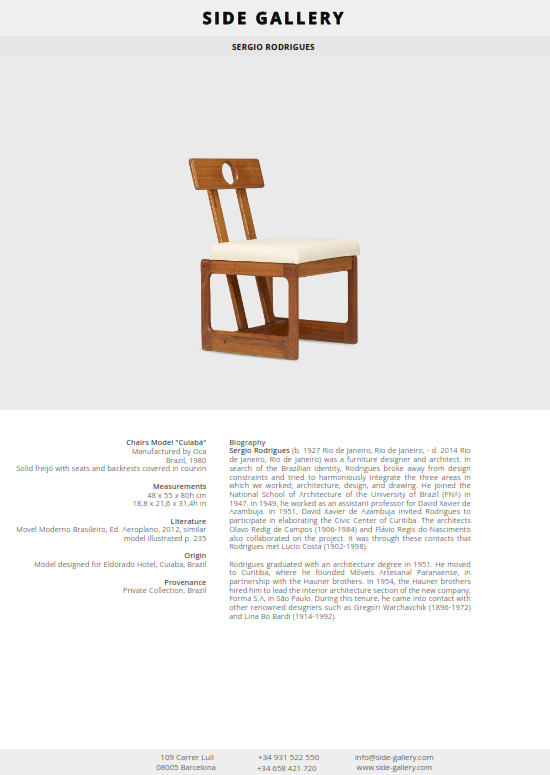 Along with essential furniture designers in Brazil, such as Joaquim Tenreiro, and Zanine Caldas, Sergio Rodrigues has played a decisive role in the history of Brazilian furniture. He is the author of various works and always developed furniture consistent with the evolution of architecture during his life.