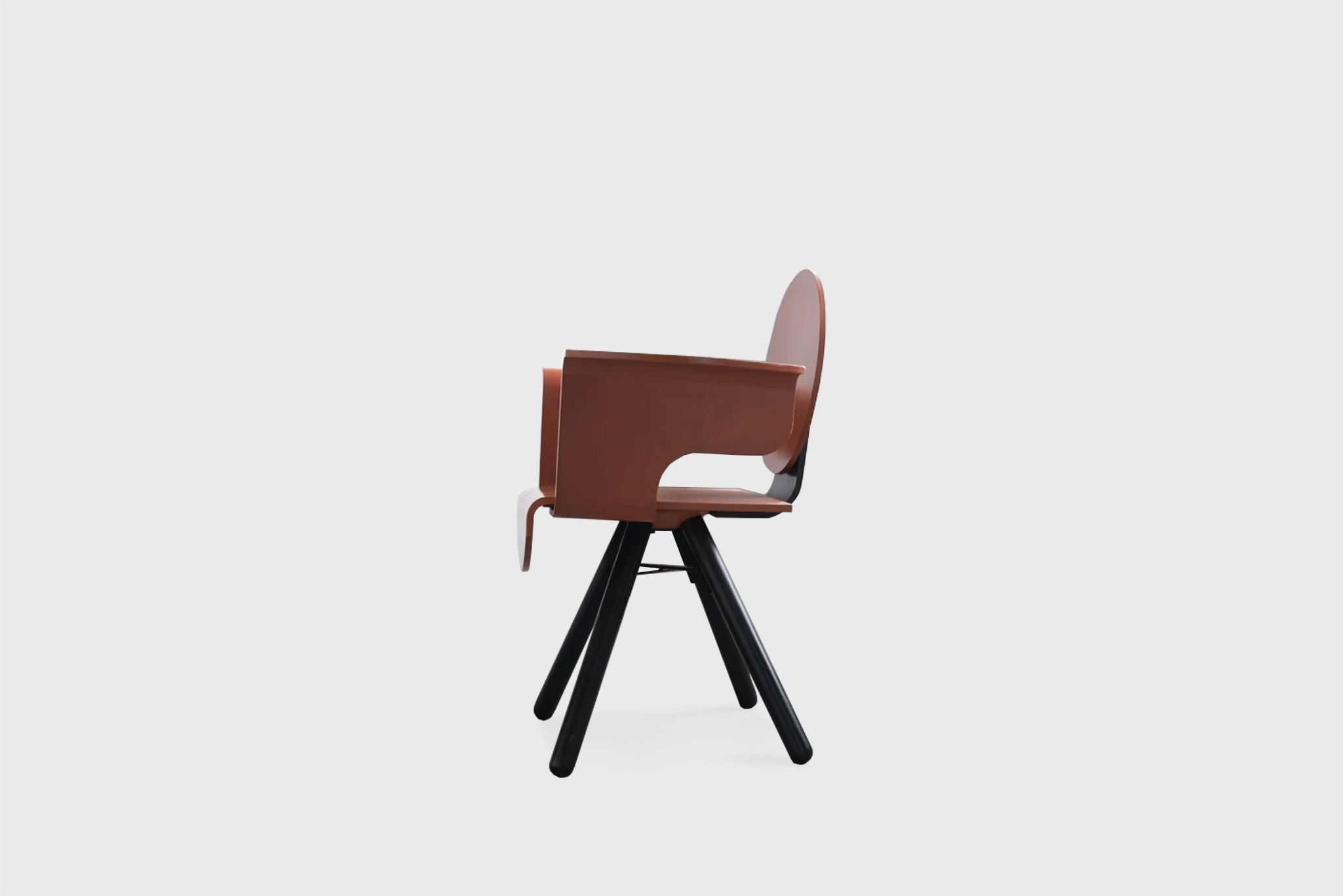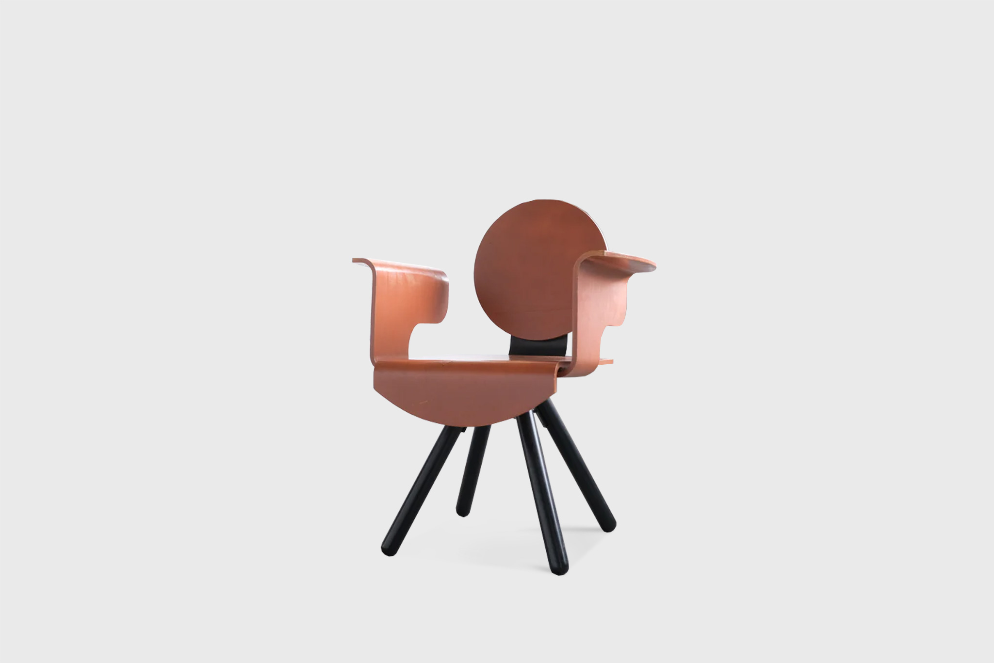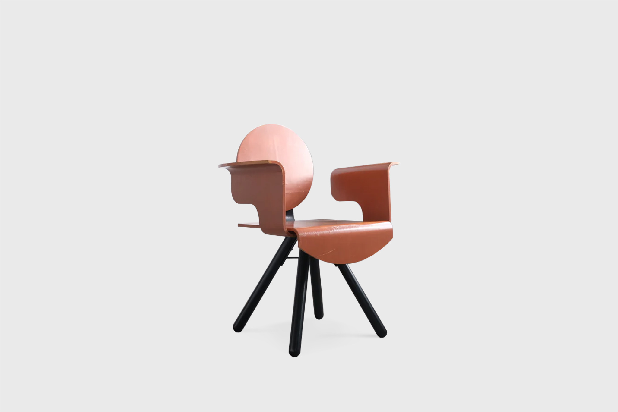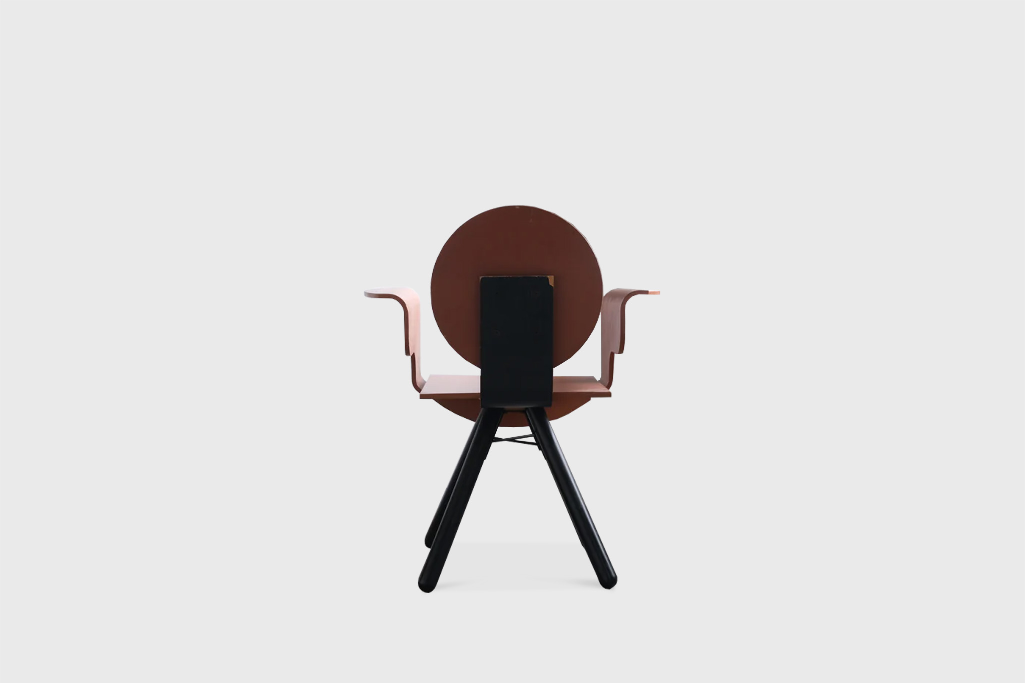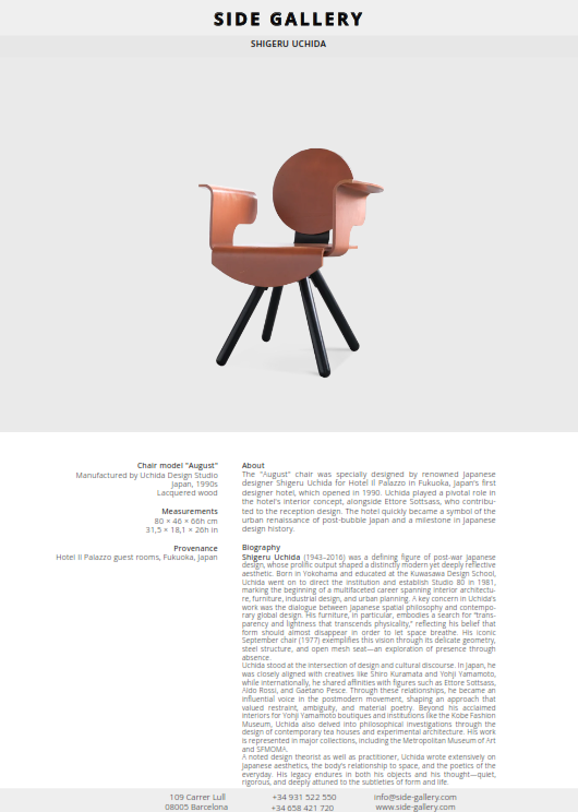 The "August" chair was specially designed by renowned Japanese designer Shigeru Uchida for Hotel Il Palazzo in Fukuoka, Japan’s first designer hotel, which opened in 1990. Uchida played a pivotal role in the hotel's interior concept, alongside Ettore Sottsass, who contributed to the reception design. The hotel quickly became a symbol of the urban renaissance of post-bubble Japan and a milestone in Japanese design history.