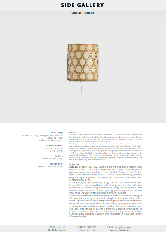 Kondo collaborated extensively with manufacturers such as Yamagiwa Corporation, creating pieces that brought artisanal techniques into broader production without compromising their precision and beauty. His works are considered seminal in mid-century Japanese design and continue to inspire designers exploring the interplay of material, form, and light.
