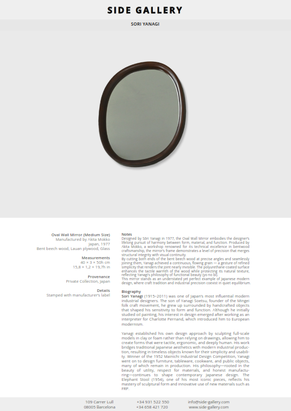 Designed by Sōri Yanagi in 1977, the Oval Wall Mirror embodies the designer’s lifelong pursuit of harmony between form, material, and function. Produced by Akita Mokko, a workshop renowned for its technical excellence in bentwood craftsmanship, the mirror’s frame demonstrates a level of precision that merges structural integrity with visual continuity.