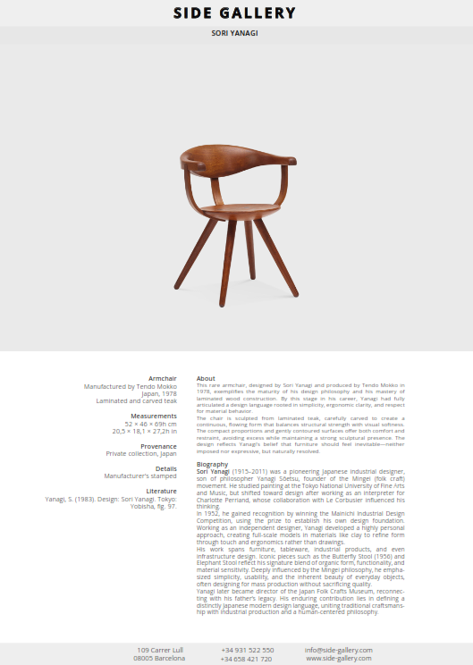 Tendo Mokko’s technical expertise in wood lamination was essential to realizing this form. Their collaboration allowed Yanagi to translate organic ideas into precise, repeatable production without sacrificing craftsmanship. As a late yet relatively rare work, this armchair stands as a refined statement of Yanagi’s lifelong pursuit of anonymous beauty and functional harmony, bridging traditional Japanese sensibility with modern industrial precision.