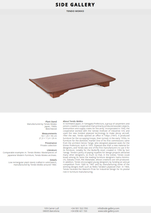 This elegant plant stand exemplifies postwar Japanese modern design, where traditional woodworking techniques met modern industrial production. Tendo Mokko, established in 1940 and known internationally for its collaborations with designers such as Sori Yanagi and Kenzo Tange, played a key role in defining the aesthetic of Japanese furniture in the mid-20th century.